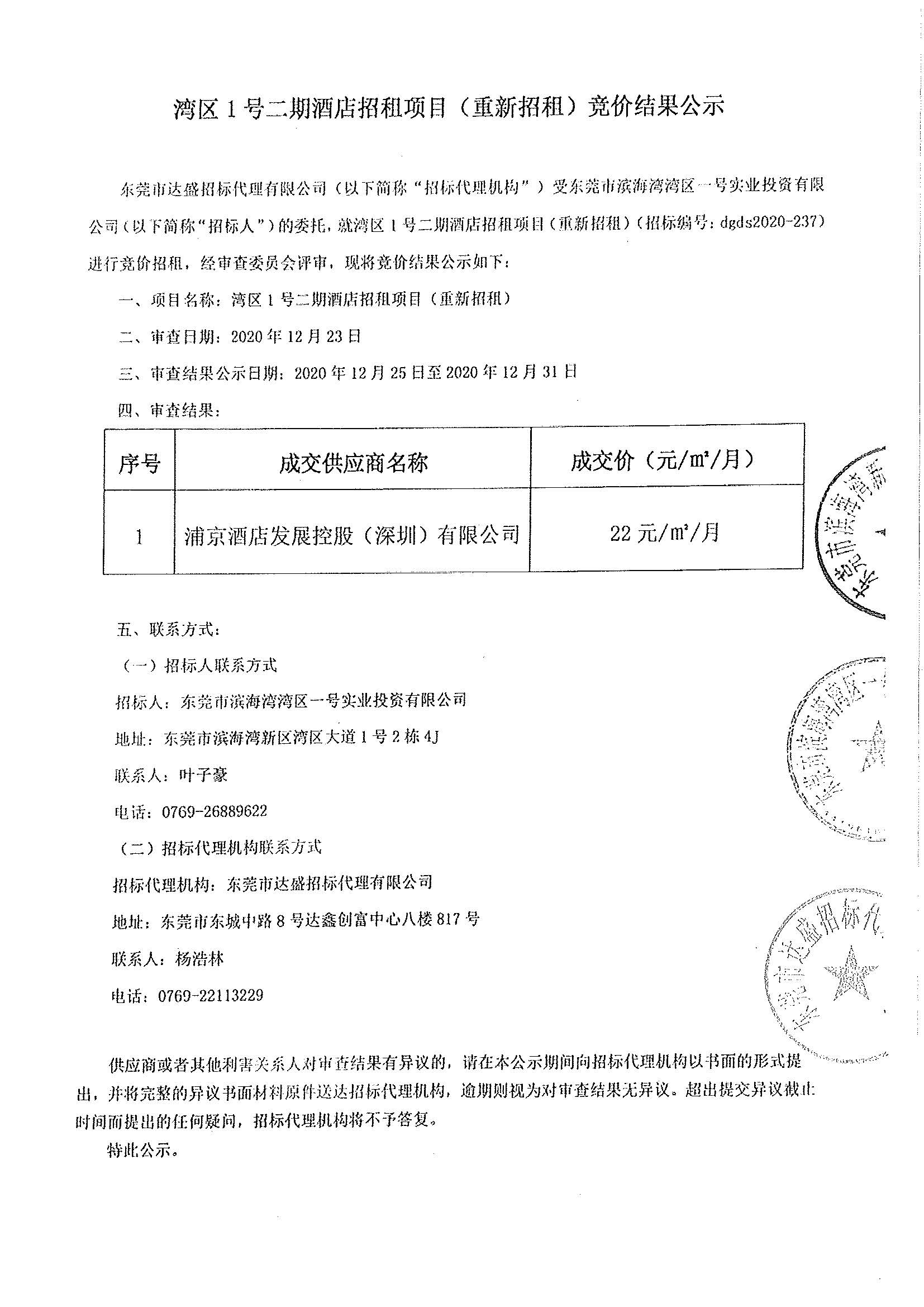 灣區(qū)1號二期酒店招租項目(重新招租)競價結果公示