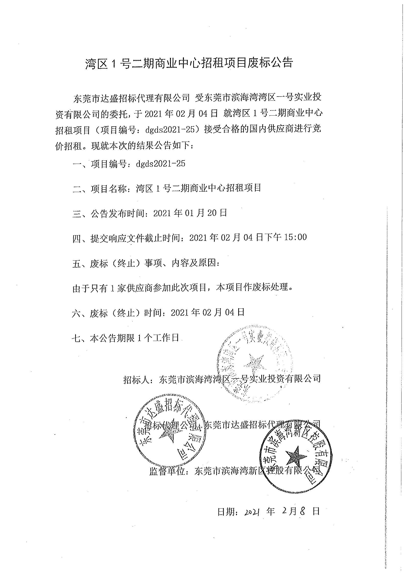 灣區(qū)1號(hào)二期商業(yè)中心招租項(xiàng)目廢標(biāo)公告