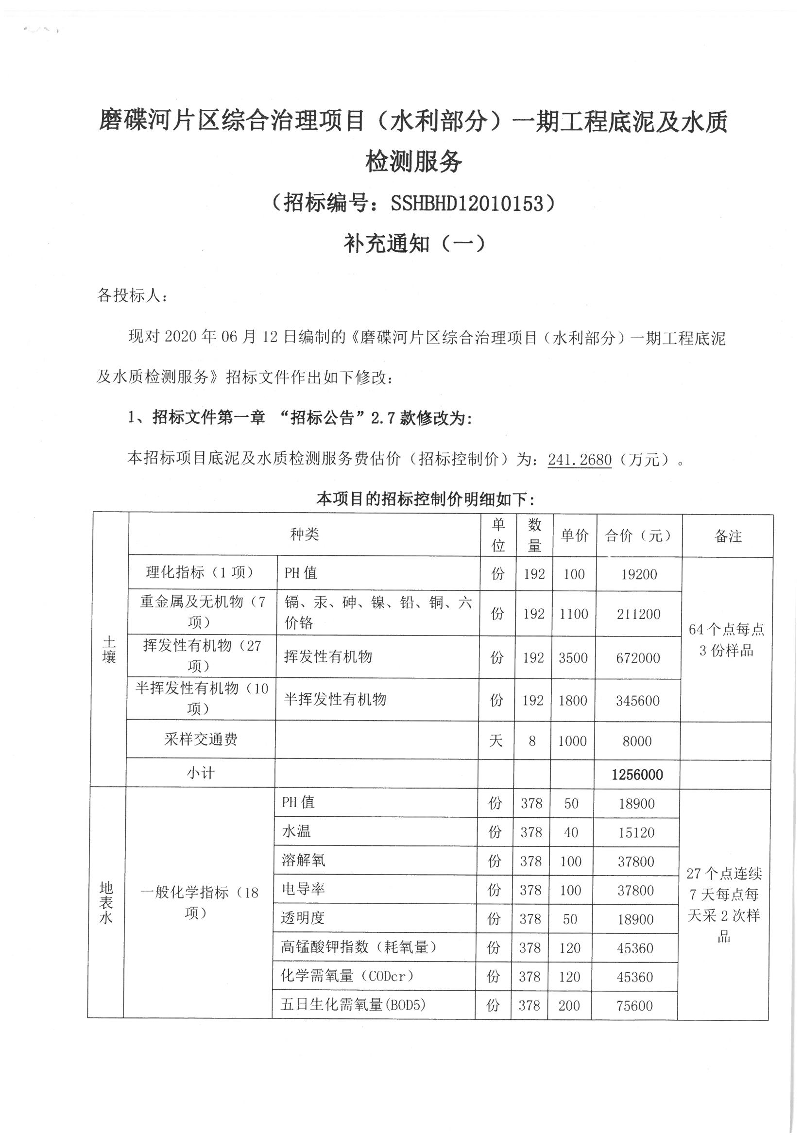 磨碟河片區(qū)綜合治理項目(水利部分)一期工程底泥及水質(zhì)檢測服務補充通知(一)