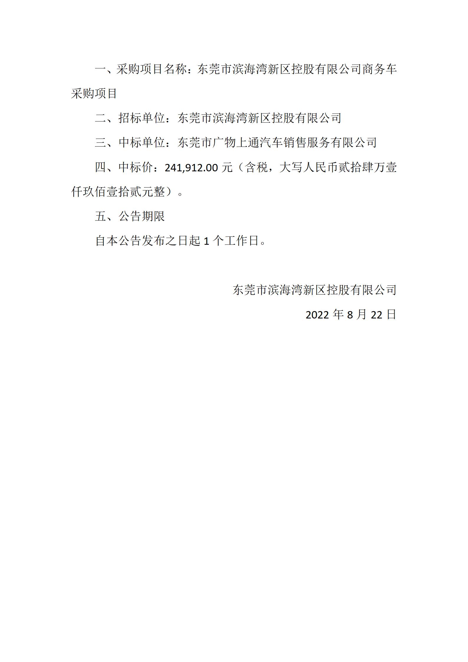 東莞市濱海灣新區(qū)控股有限公司商務(wù)車采購項目結(jié)果公告