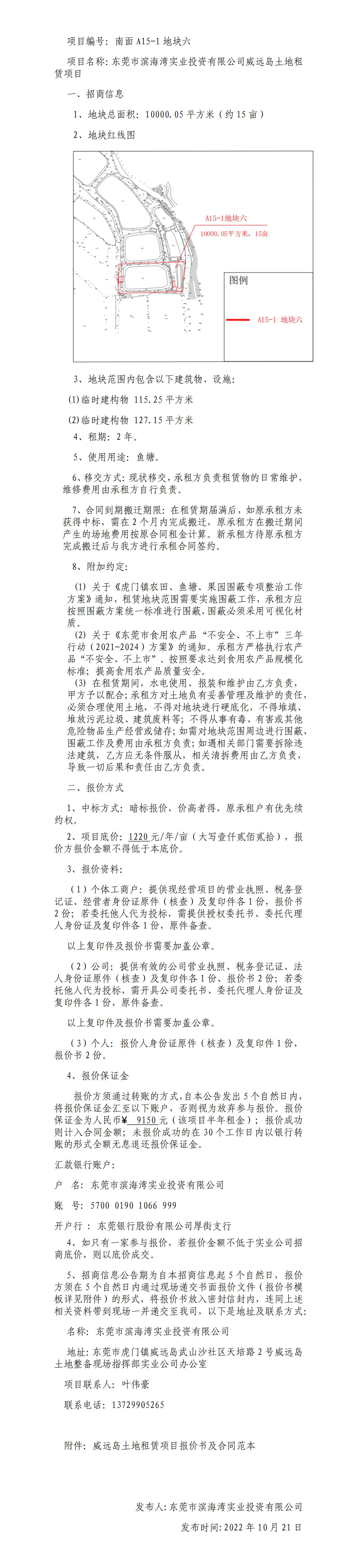 東莞市濱海灣實業(yè)投資有限公司威遠(yuǎn)島土地租賃項目招商公告(南面A15-1地塊六)