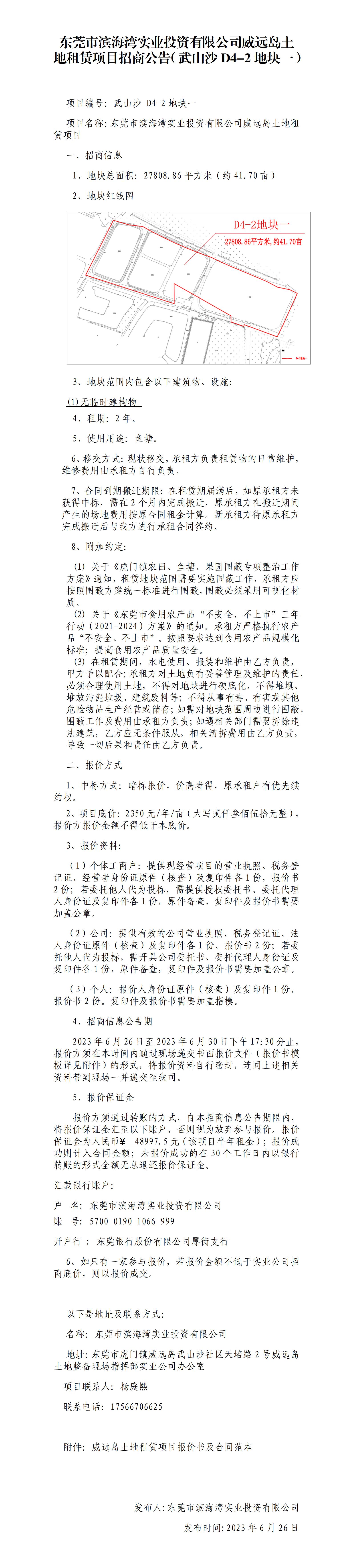 東莞市濱海灣實業(yè)投資有限公司威遠島土地租賃項目招商公告(武山沙D4-2地塊一)