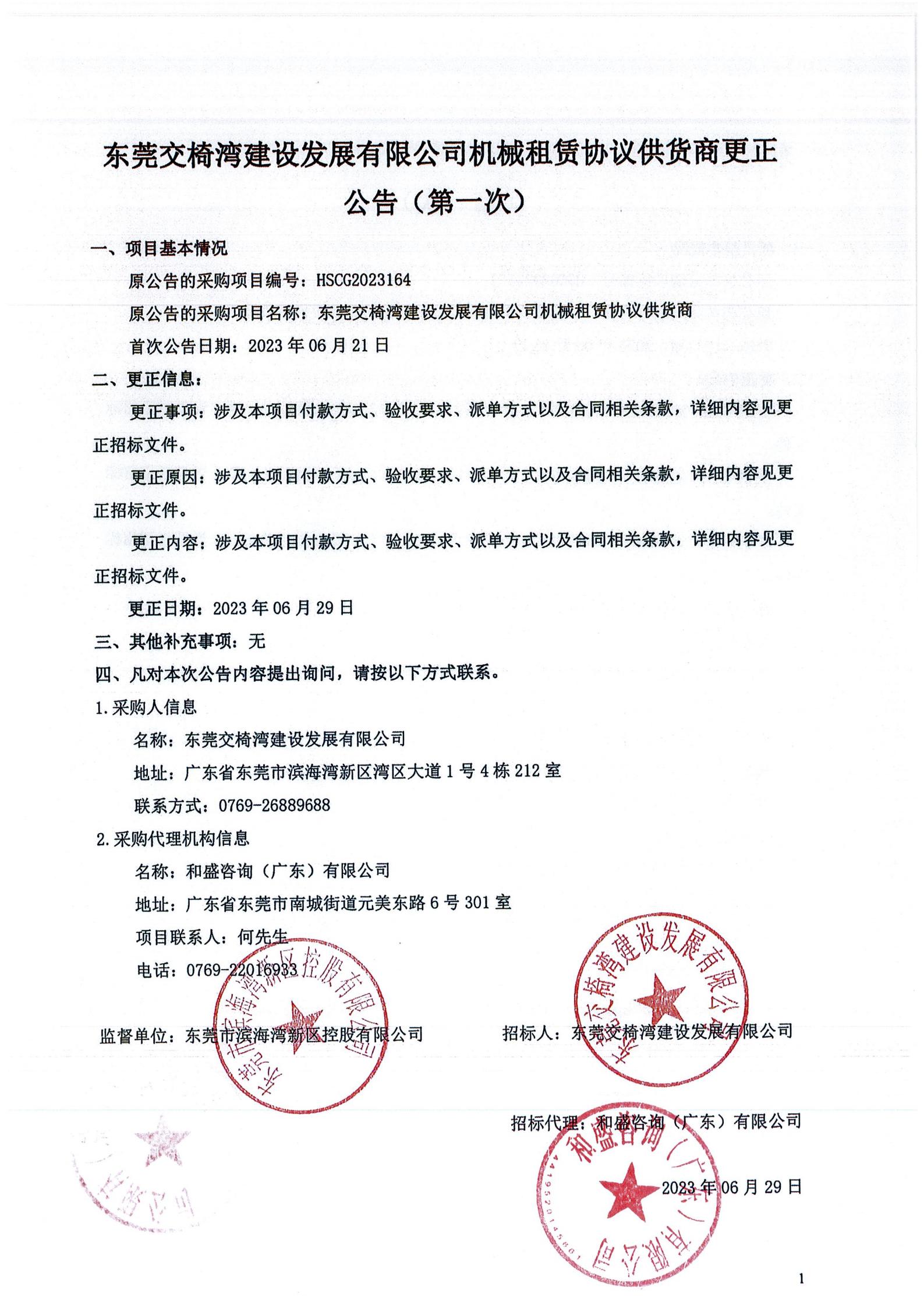 東莞交椅灣建設(shè)發(fā)展有限公司機(jī)械租賃協(xié)議供貨商更正公告(第一次)