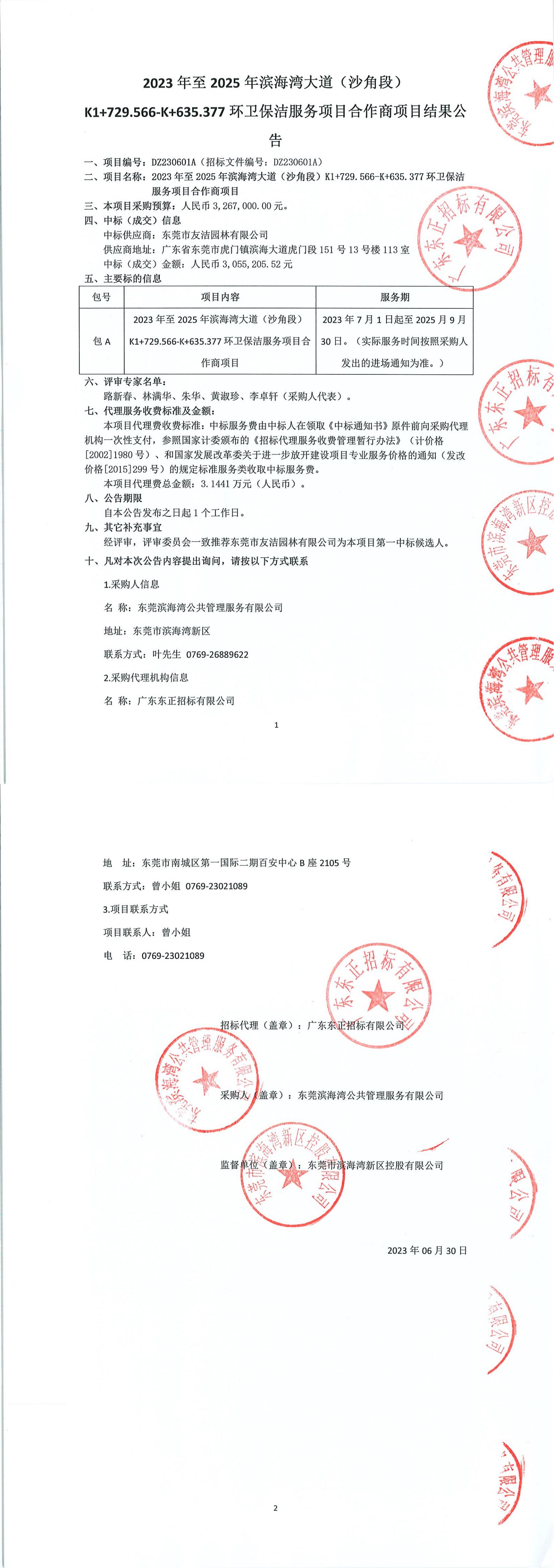 2023年至2025年濱海灣大道(沙角段)K1+729.566-K+635.377環(huán)衛(wèi)保潔服務(wù)項目合作商項目結(jié)果公告