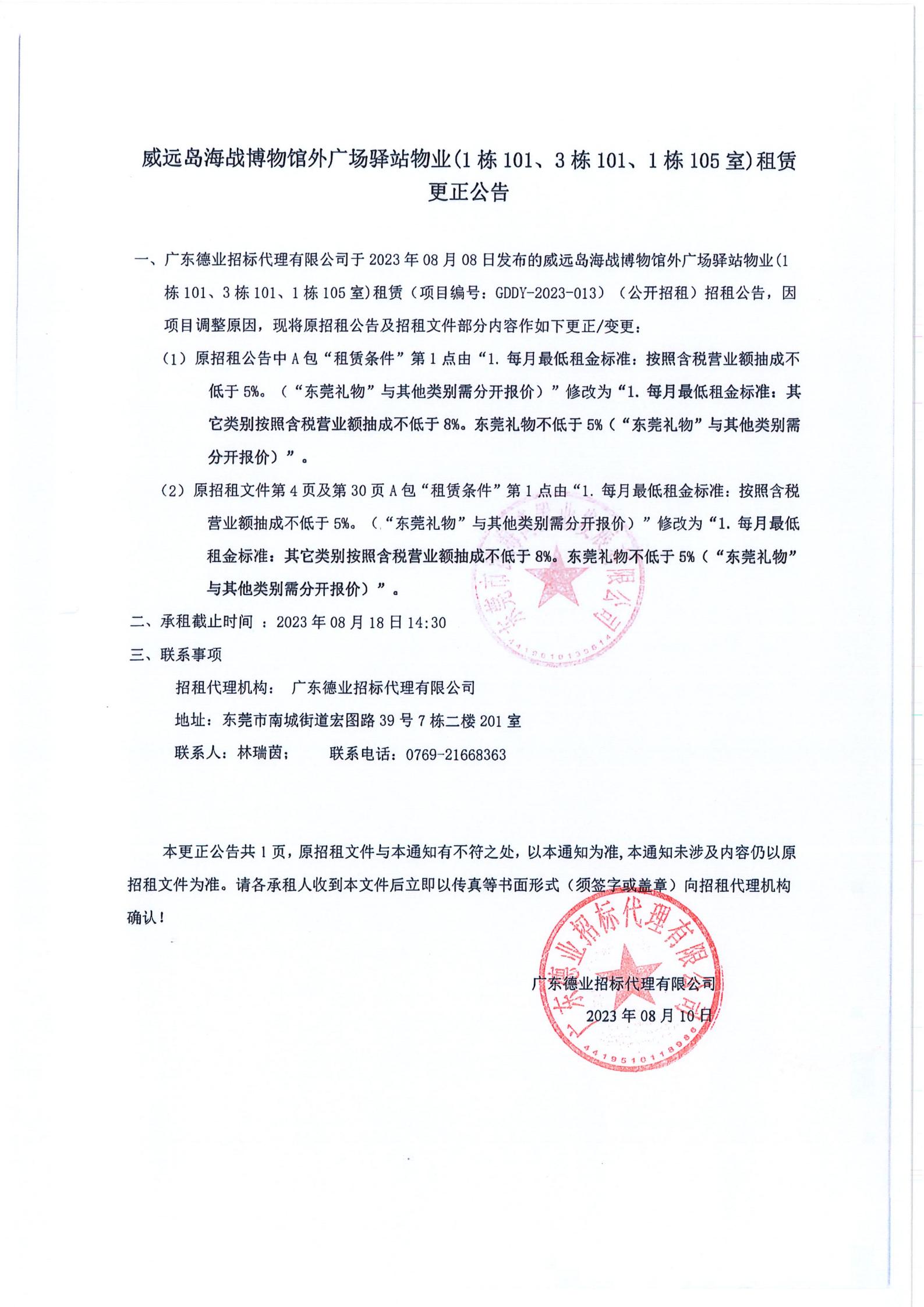 威遠(yuǎn)島海戰(zhàn)博物館外廣場驛站物業(yè)(1棟101、3棟101、1棟105室)租賃更正公告