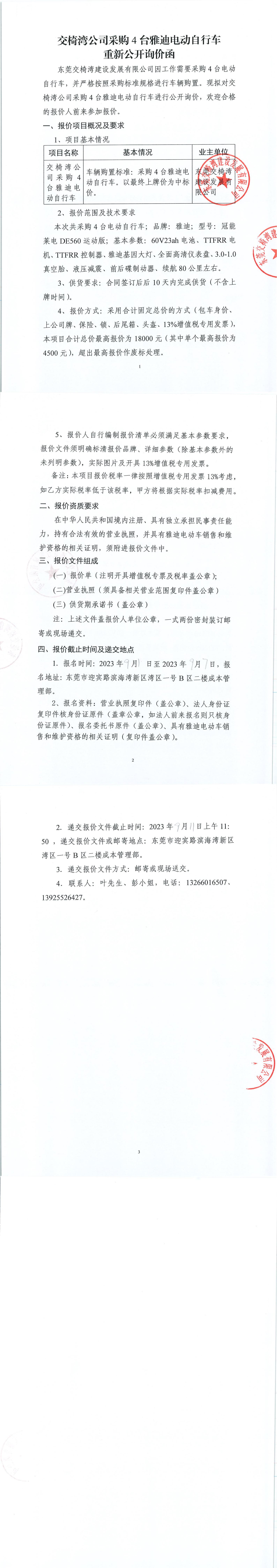 交椅灣公司采購4臺(tái)雅迪電動(dòng)自行車重新公開詢價(jià)函