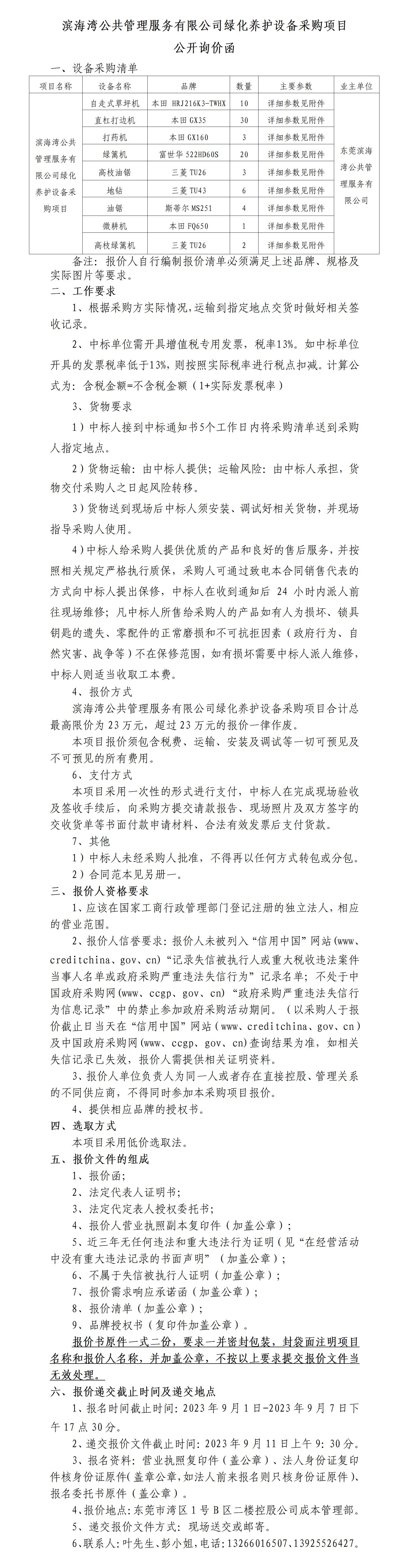 濱海灣公共管理服務(wù)有限公司綠化養(yǎng)護(hù)設(shè)備采購項(xiàng)目公開詢價(jià)函