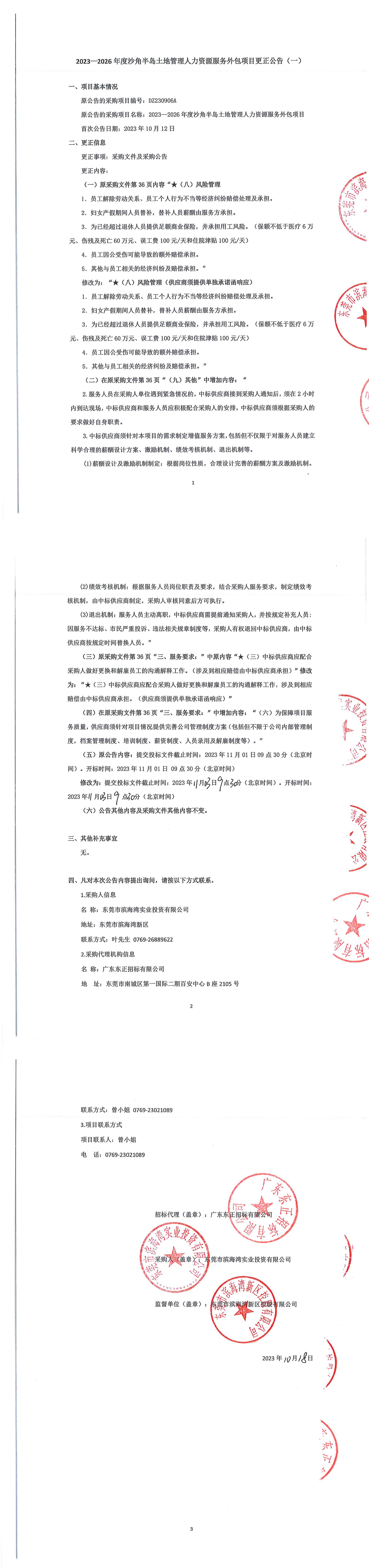 2023—2026年度沙角半島土地管理人力資源服務外包項目更正公告(一)