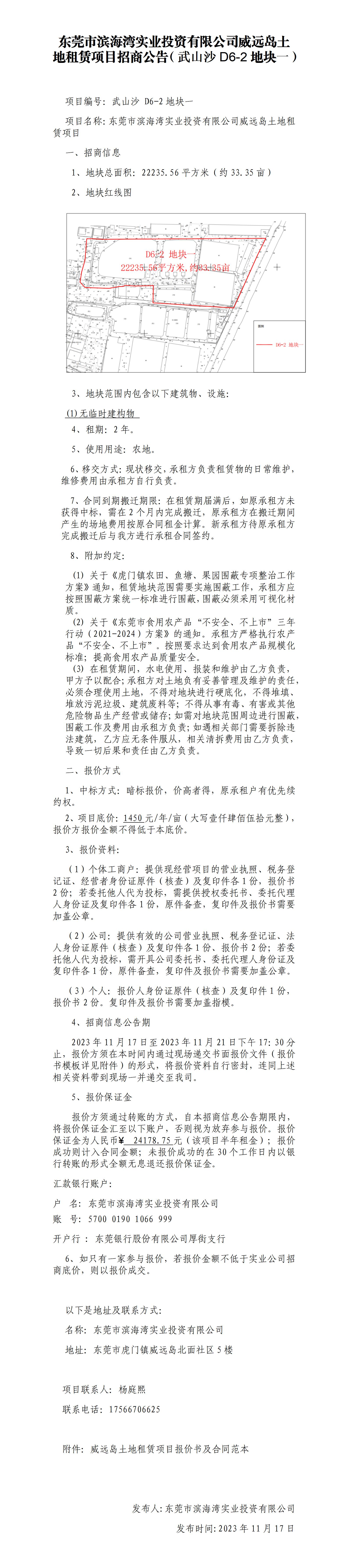東莞市濱海灣實業(yè)投資有限公司威遠(yuǎn)島土地租賃項目招商公告(武山沙D6-2地塊一)