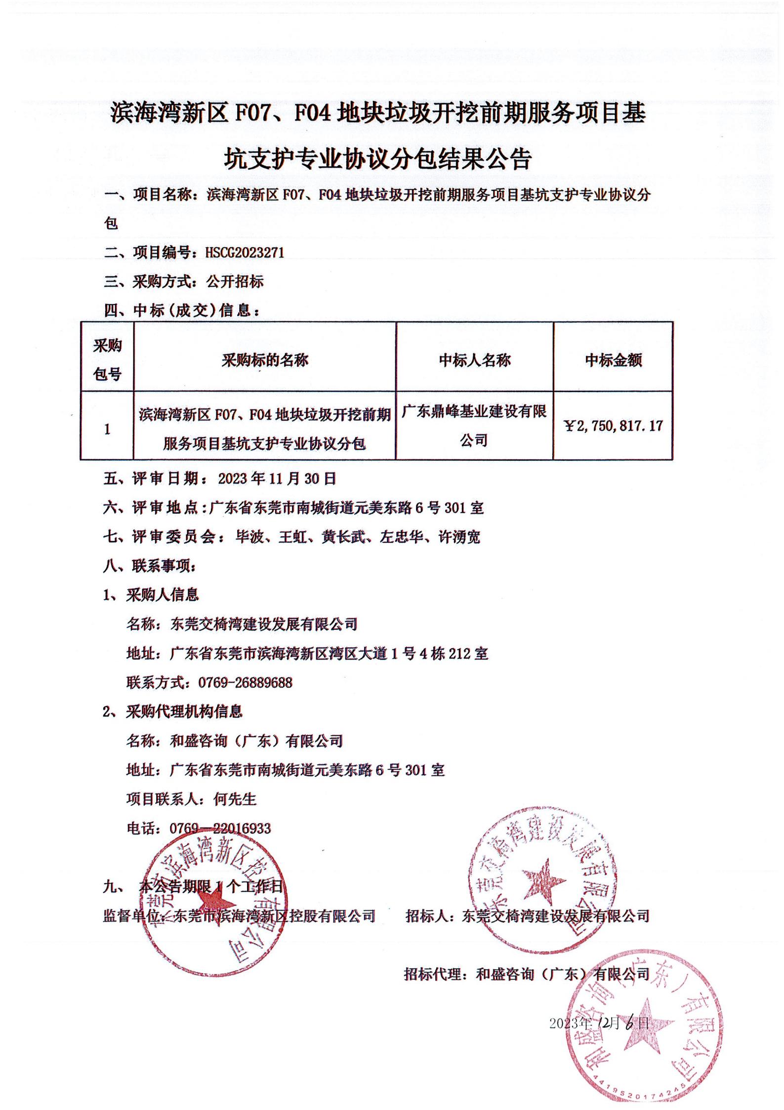 濱海灣新區(qū)F07、F04地塊垃圾開挖前期服務(wù)項(xiàng)目基坑支護(hù)專業(yè)協(xié)議分包結(jié)果公告