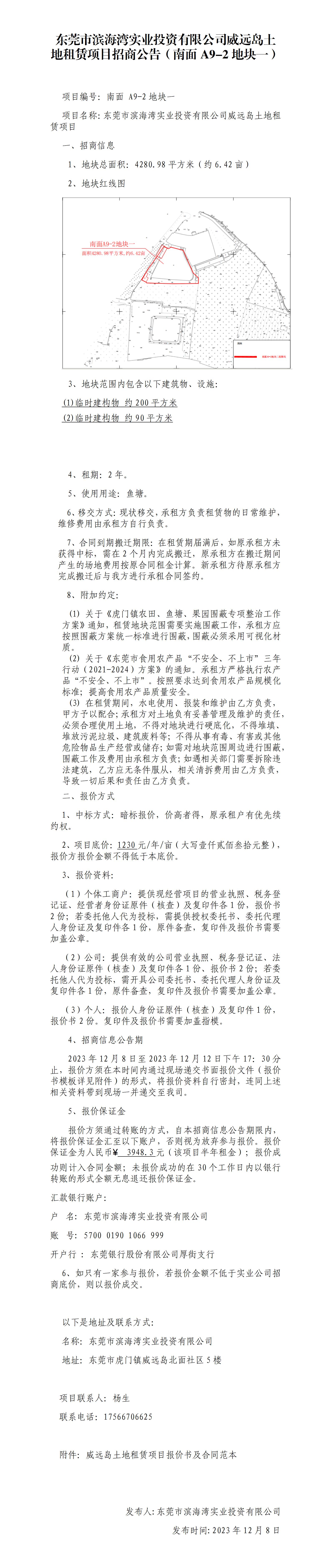 東莞市濱海灣實業(yè)投資有限公司威遠島土地租賃項目招商公告(南面A9-2地塊一)