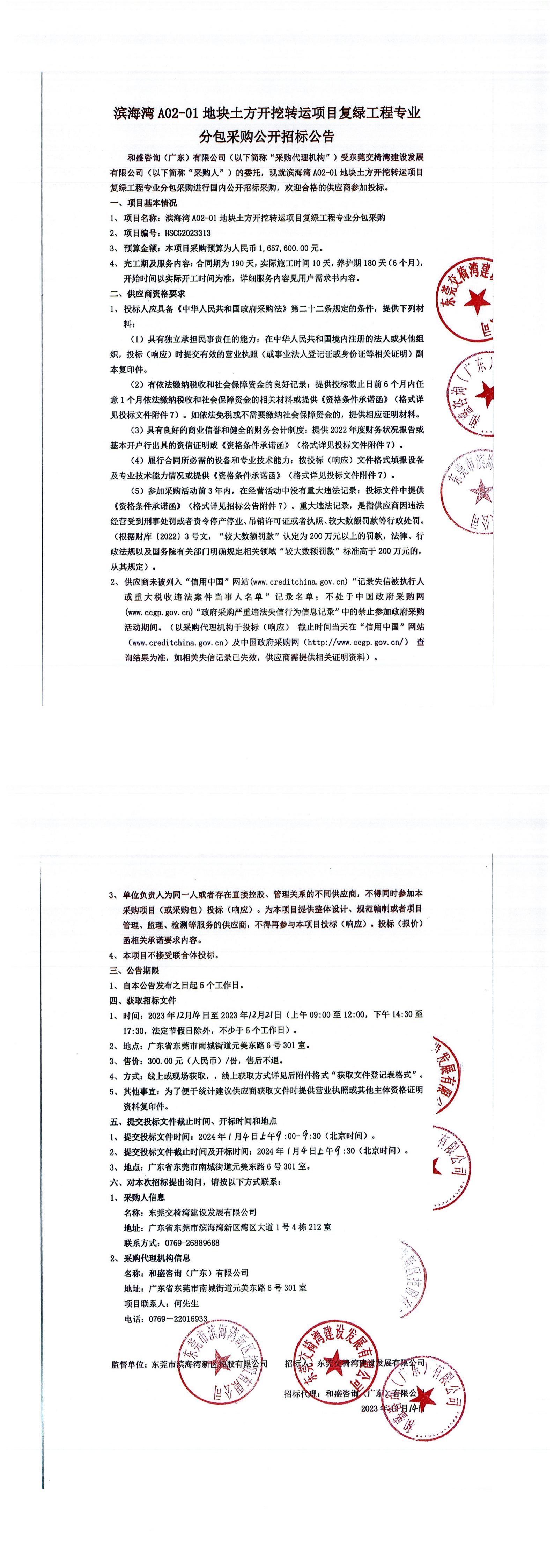 濱海灣A02-01地塊土方開挖轉(zhuǎn)運項目復綠工程專業(yè)分包采購公開招標公告