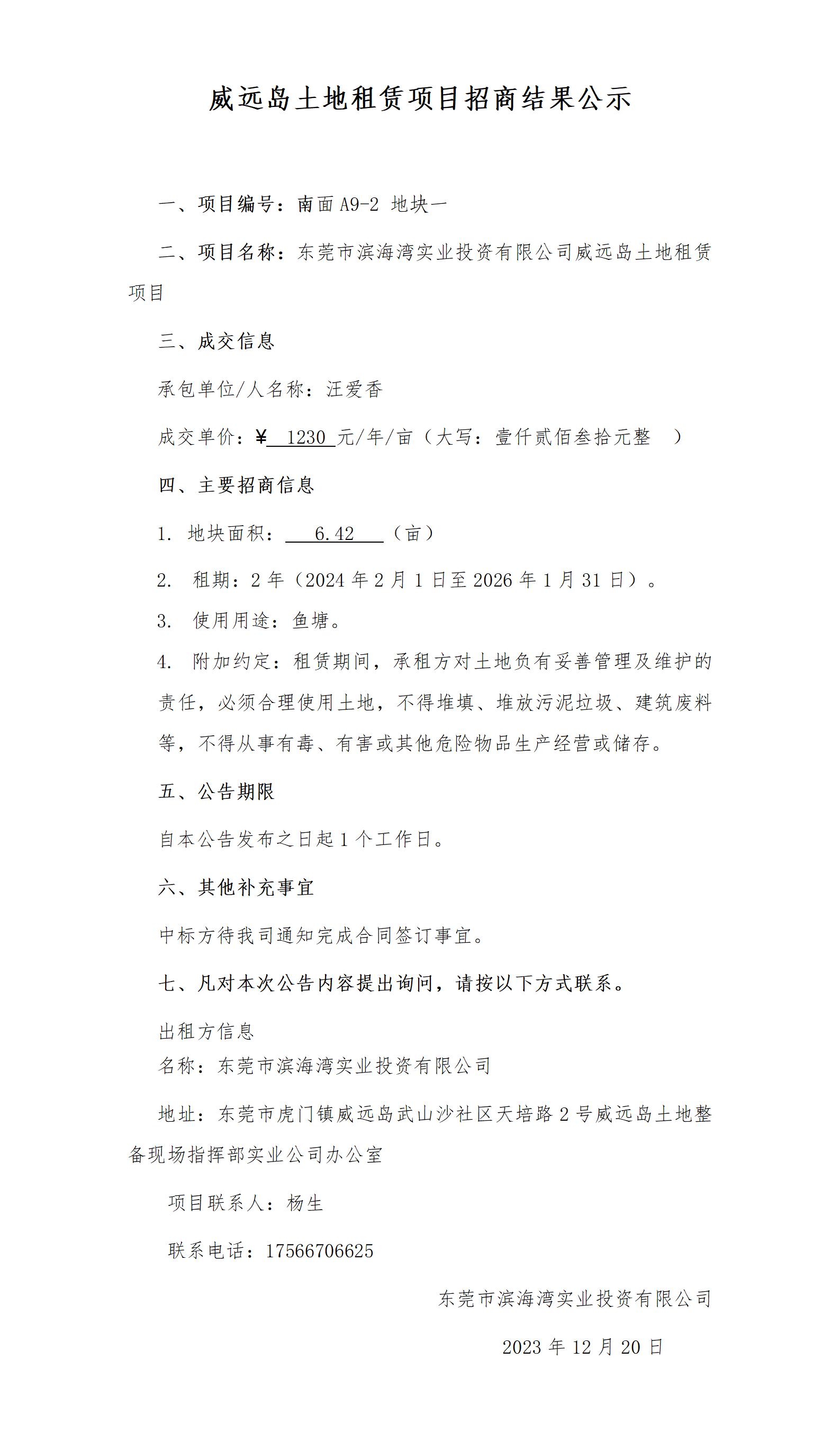 威遠島土地租賃項目招商結(jié)果公示(南面A9-2地塊一)