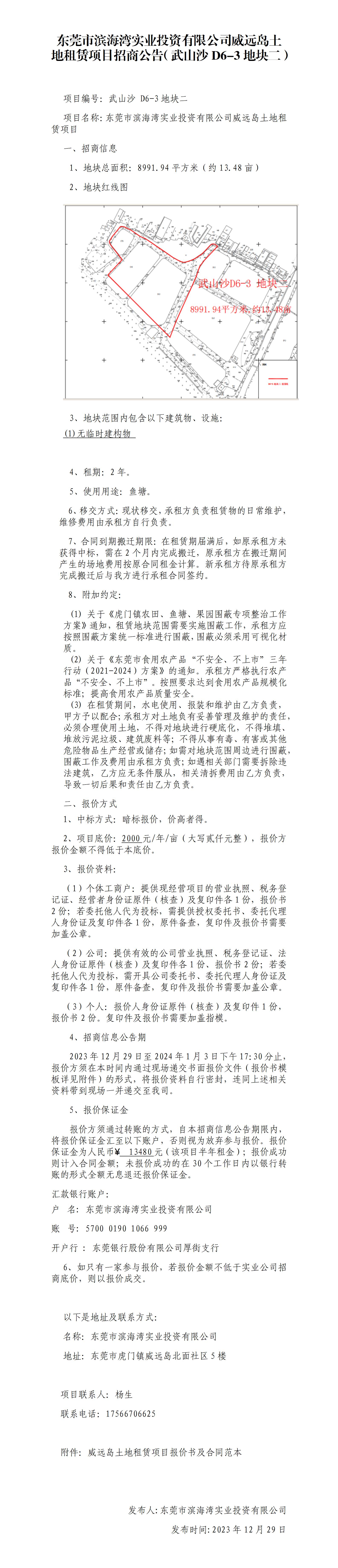 東莞市濱海灣實業(yè)投資有限公司威遠島土地租賃項目招商公告(武山沙D6-3地塊二)