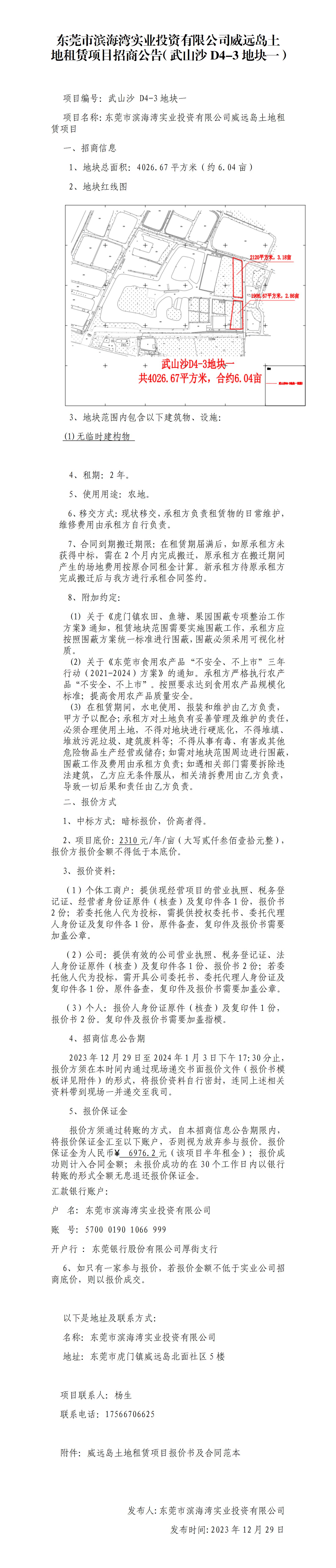 東莞市濱海灣實(shí)業(yè)投資有限公司威遠(yuǎn)島土地租賃項(xiàng)目招商公告(武山沙D4-3地塊一)