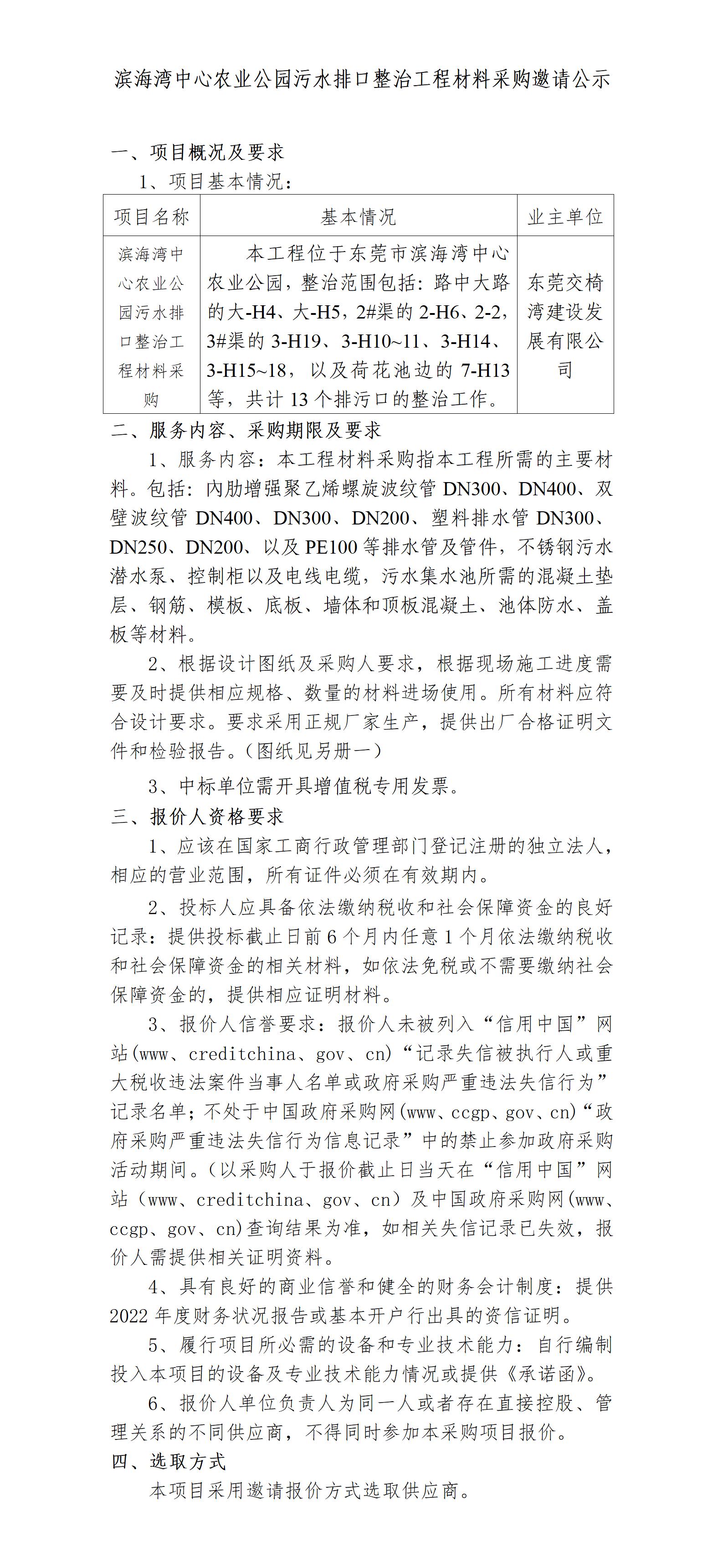 濱海灣中心農(nóng)業(yè)公園污水排口整治工程材料采購(gòu)邀請(qǐng)公示