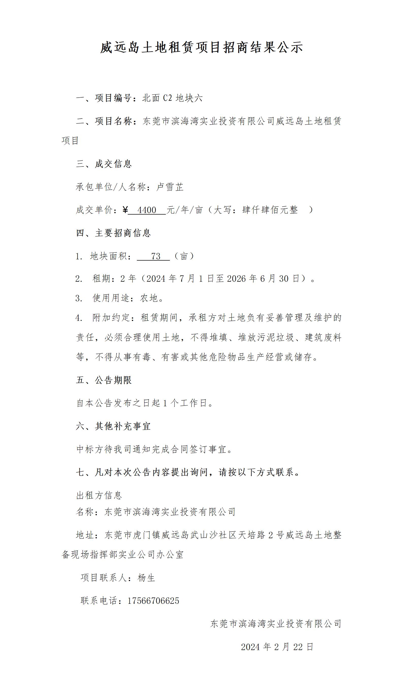 威遠(yuǎn)島土地租賃項(xiàng)目招商結(jié)果公示(北面C2地塊六)