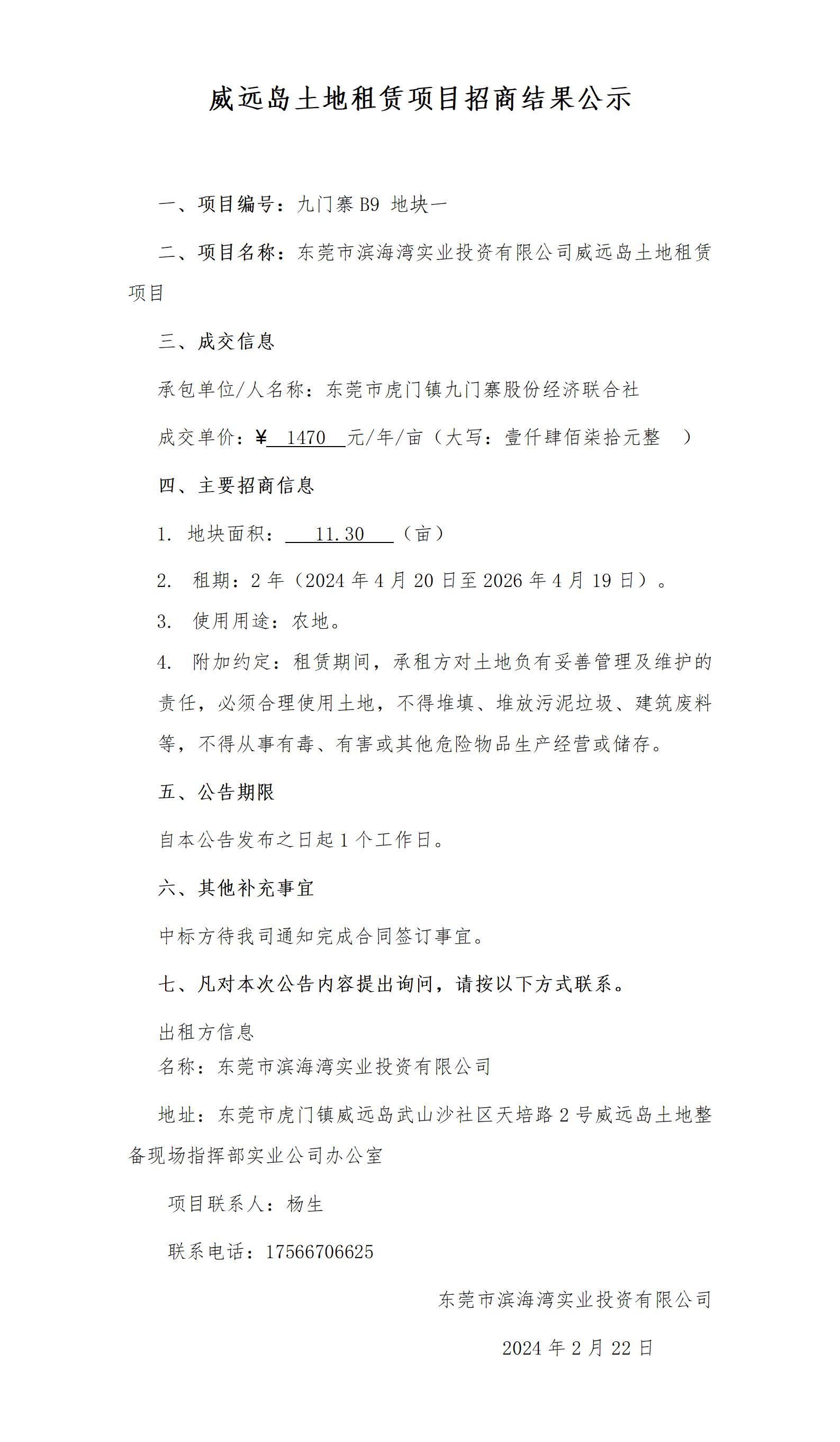 威遠(yuǎn)島土地租賃項(xiàng)目招商結(jié)果公示(九門寨B9地塊一)