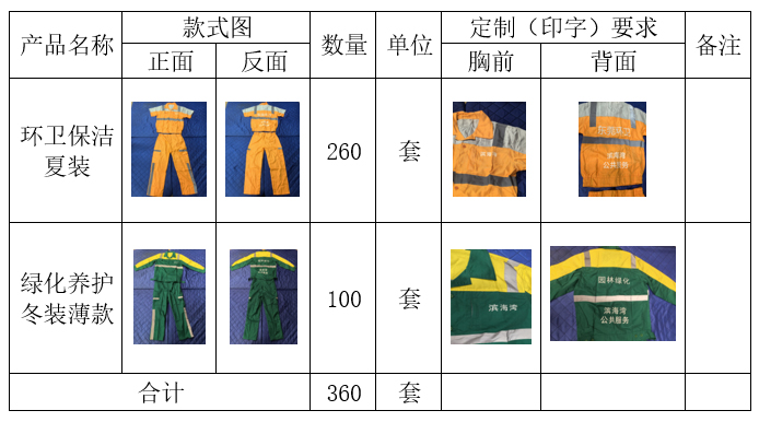 根據(jù)濱海灣新區(qū)市政環(huán)衛(wèi)保潔及綠化養(yǎng)護(hù)服務(wù)項目合同及濱海灣城管分局要求,需要統(tǒng)一員工工作服、保持服裝整潔。目前我司環(huán)衛(wèi)保潔及綠化養(yǎng)護(hù)工作人員使用的工作服出現(xiàn)破損和殘舊。為了提升公司服務(wù)形象,我司計劃更換一批環(huán)衛(wèi)保潔及綠化養(yǎng)護(hù)工作服。