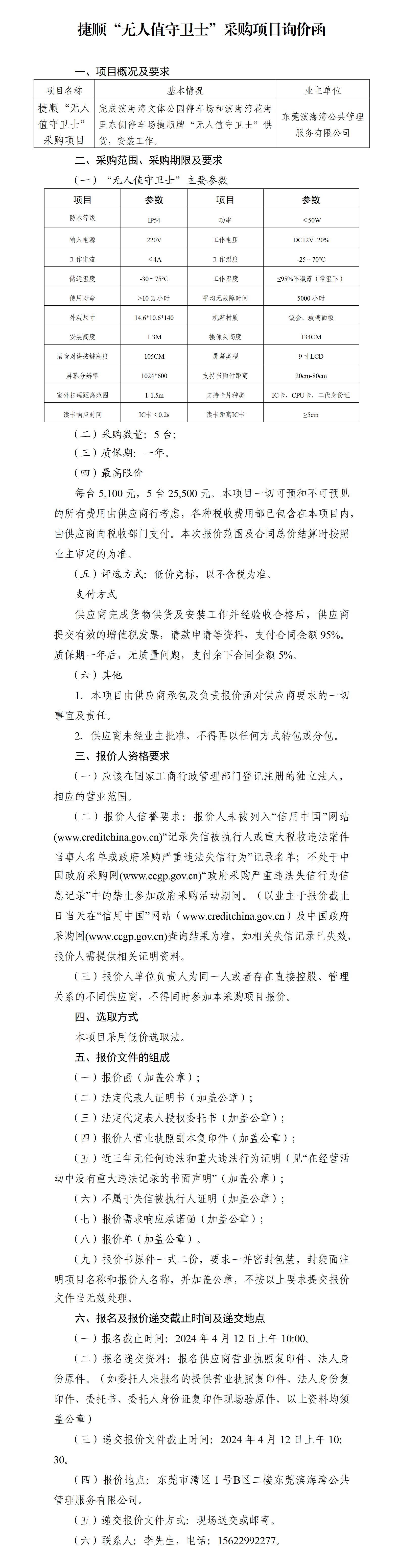 捷順“無(wú)人值守衛(wèi)士”采購(gòu)項(xiàng)目詢價(jià)函(報(bào)價(jià)文件)