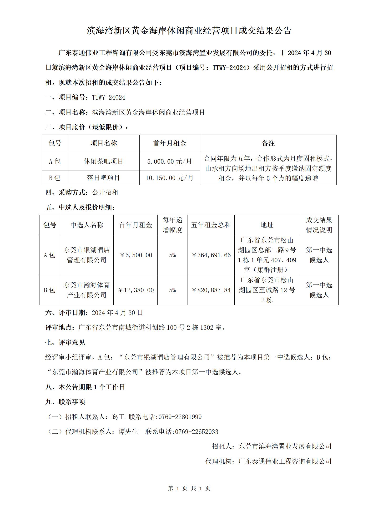 濱海灣新區(qū)黃金海岸休閑商業(yè)經(jīng)營(yíng)項(xiàng)目成交結(jié)果公告