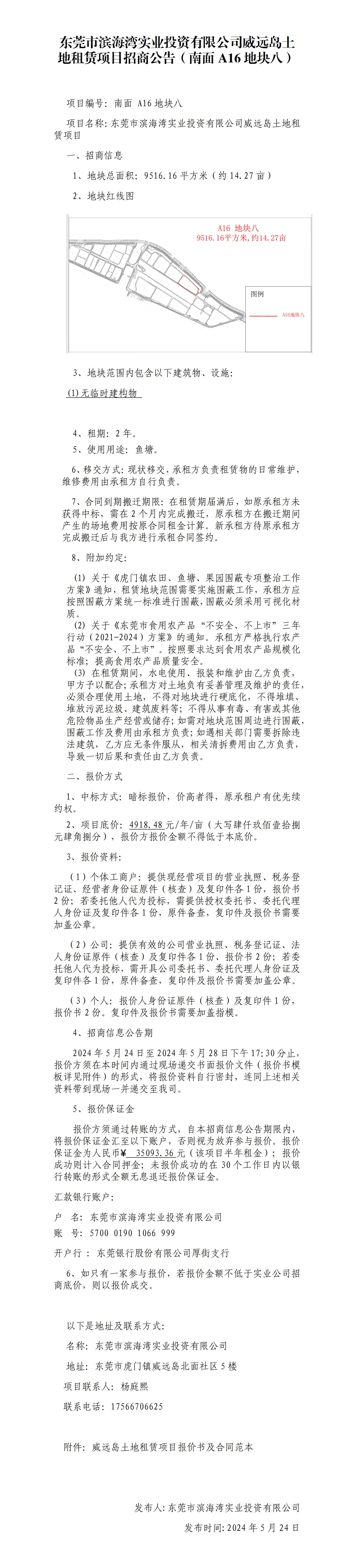 東莞市濱海灣實業(yè)投資有限公司威遠(yuǎn)島土地租賃項目招商公告(南面A16 地塊八)