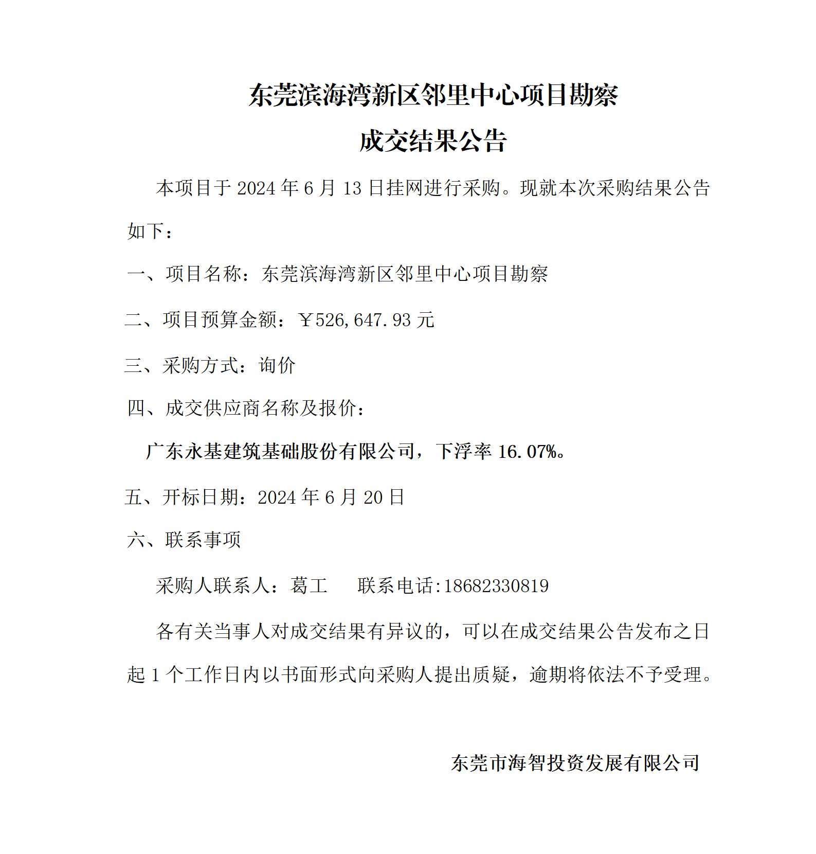 東莞濱海灣新區(qū)鄰里中心項(xiàng)目勘察成交結(jié)果公告