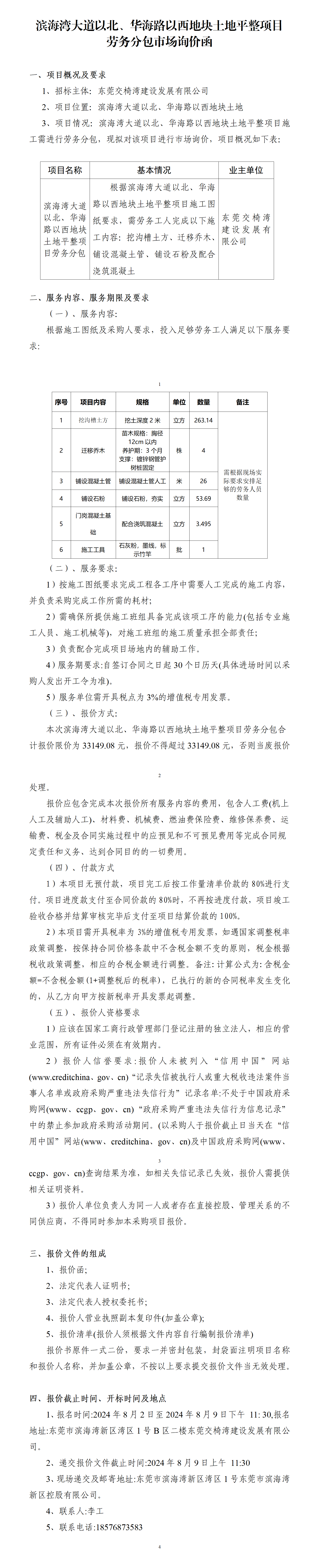 濱海灣大道以北、華海路以西地塊土地平整項目勞務分包市場詢價函