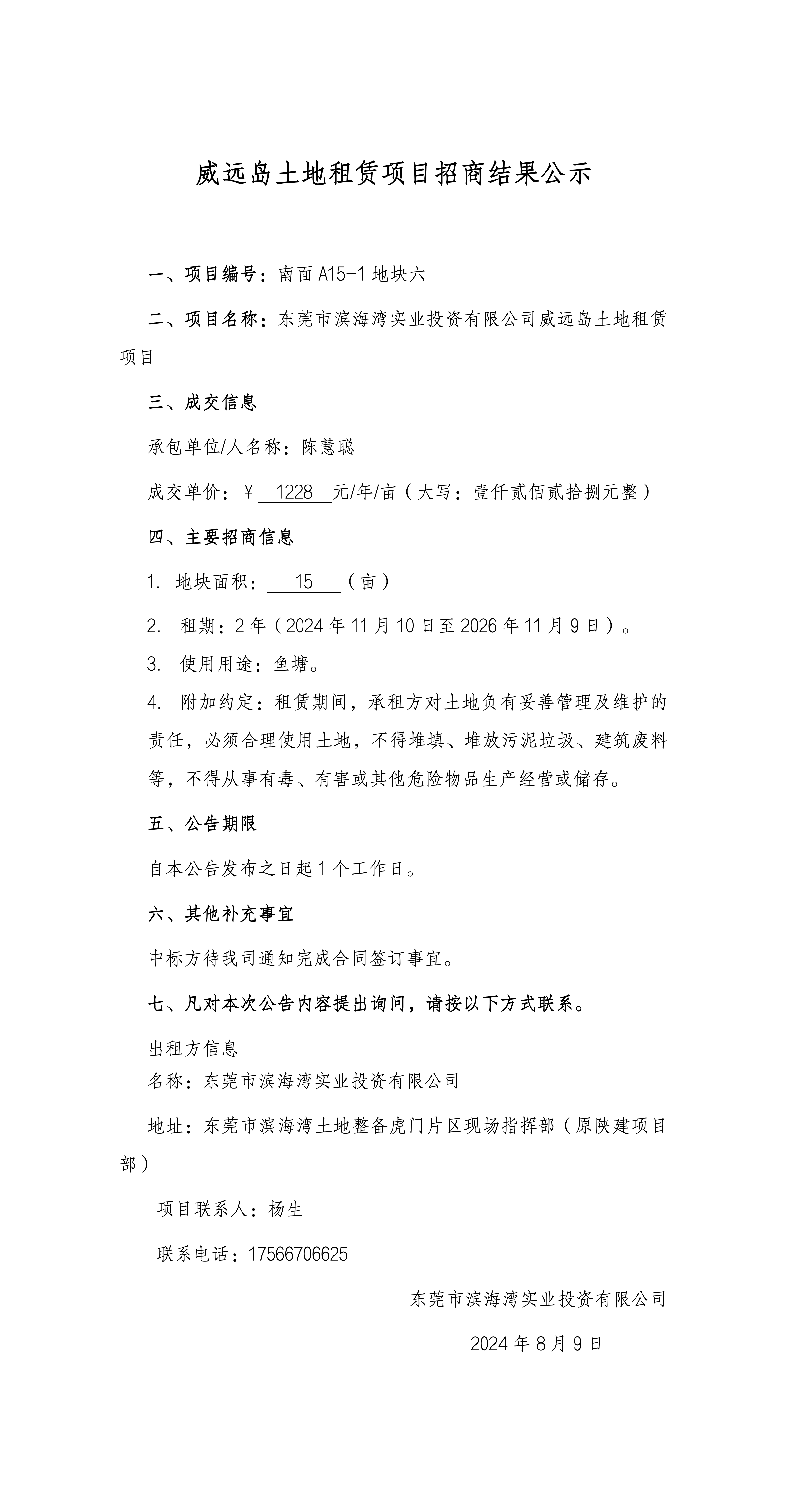 威遠島土地租賃項目招商結(jié)果公示(南面A15-1地塊六)