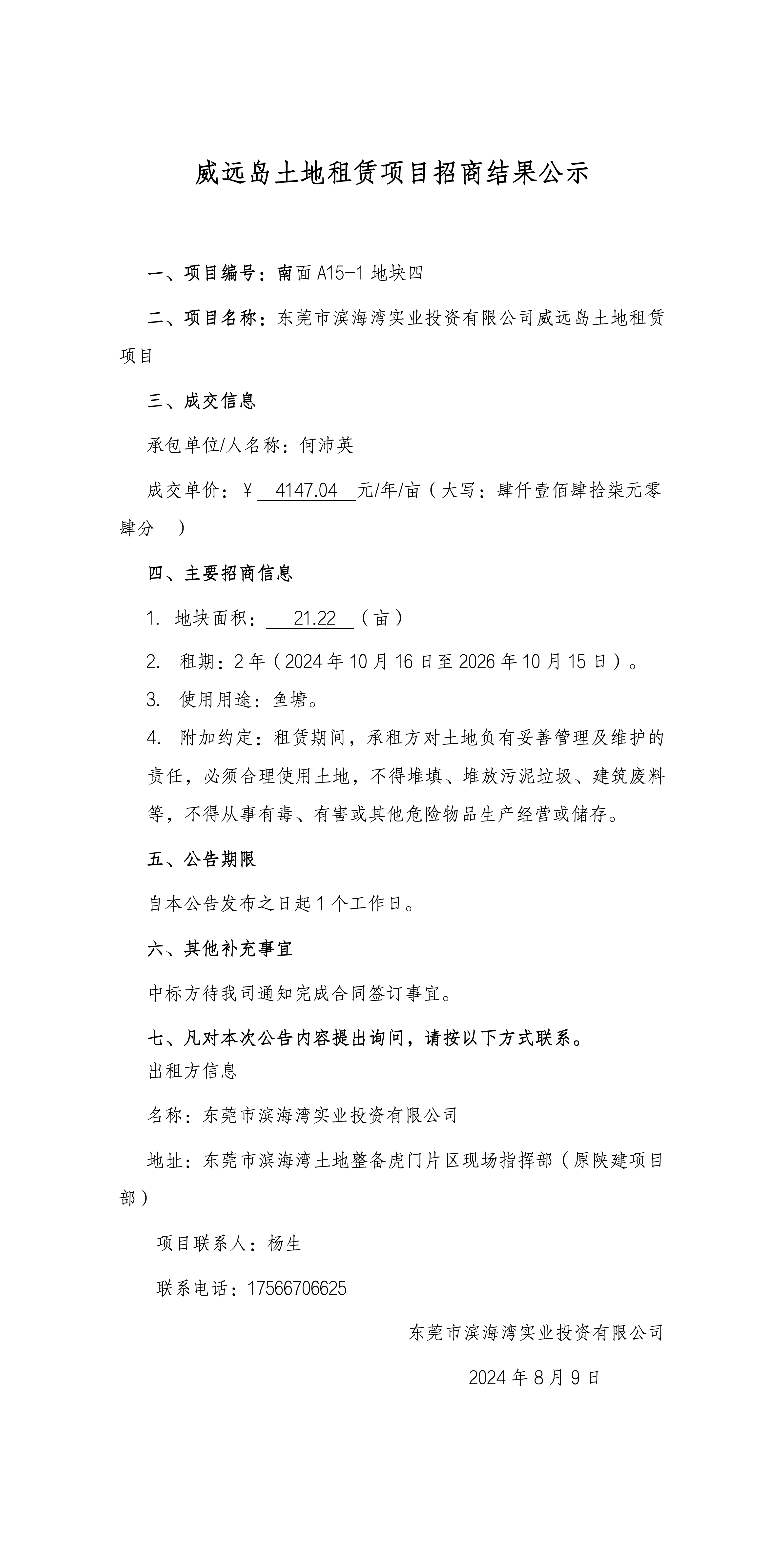 威遠(yuǎn)島土地租賃項(xiàng)目招商結(jié)果公示(南面A15-1地塊四)