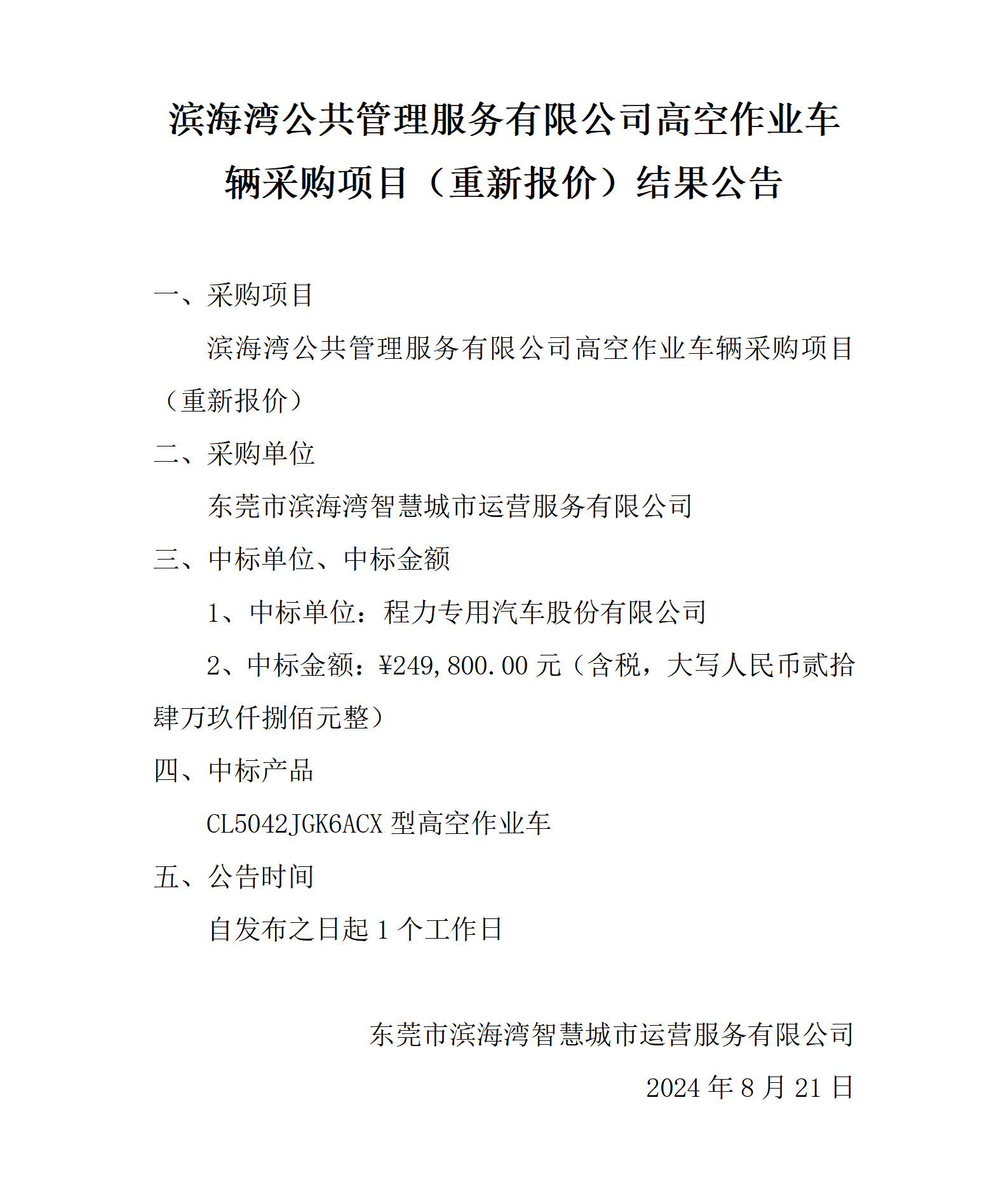 濱海灣公共管理服務有限公司高空作業(yè)車輛采購項目(重新報價)結果公告