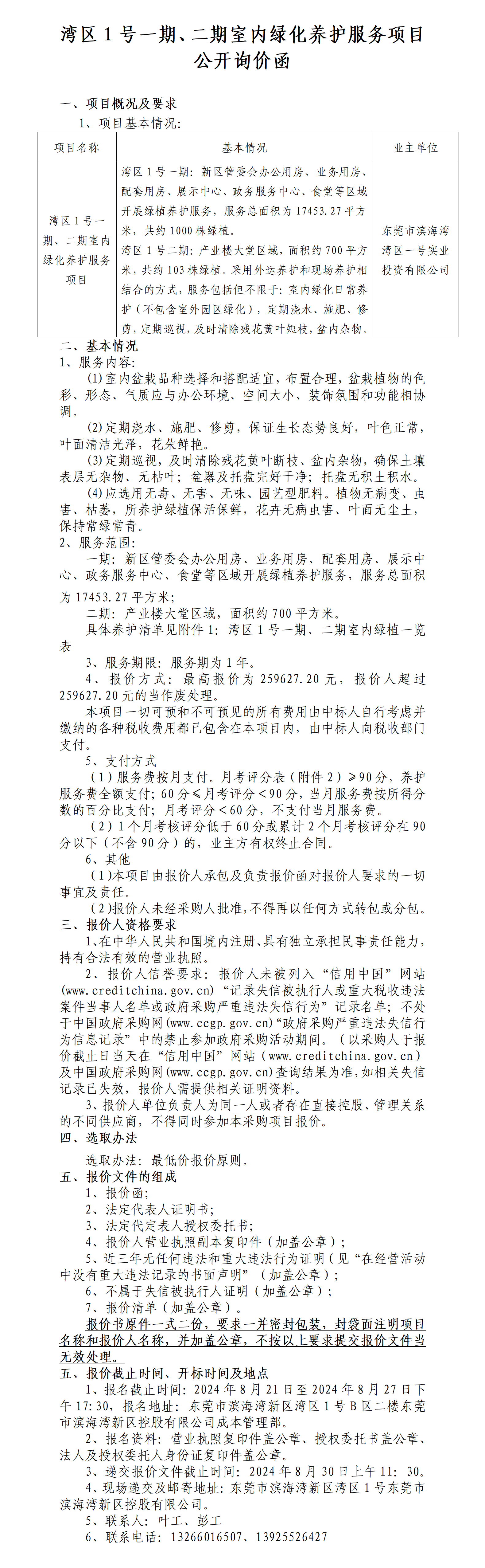 灣區(qū)1號(hào)一期、二期室內(nèi)綠化養(yǎng)護(hù)服務(wù)項(xiàng)目公開詢價(jià)函
