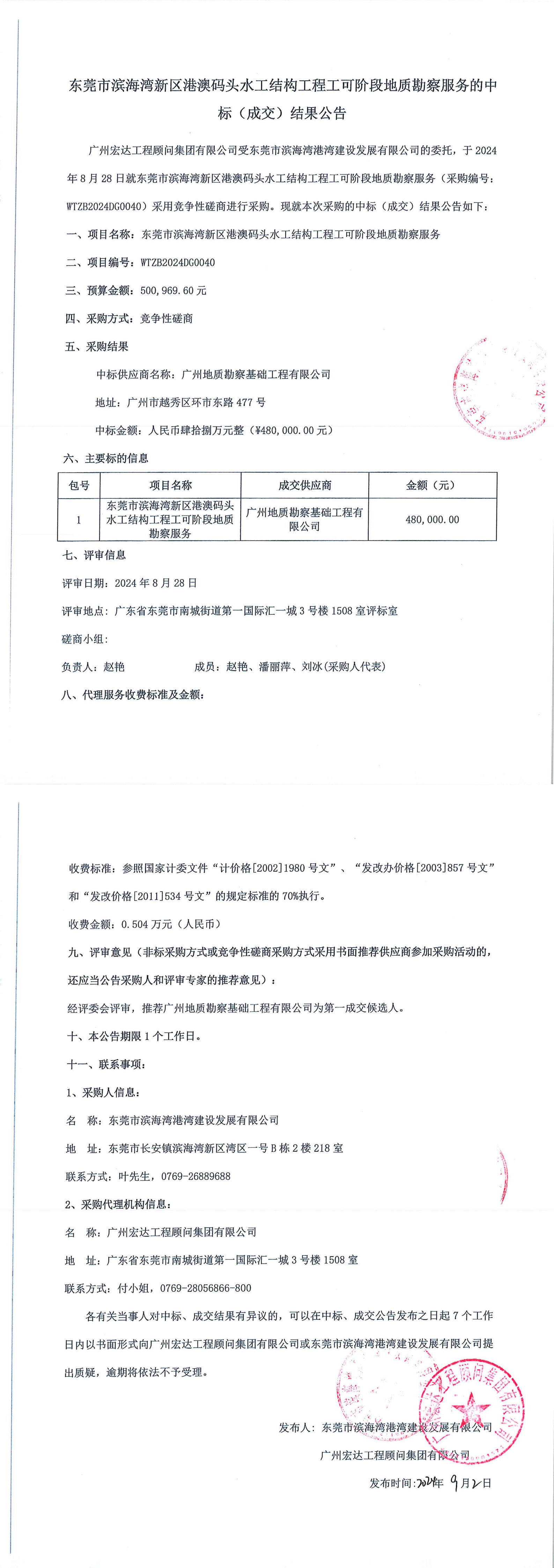 東莞市濱海灣新區(qū)港澳碼頭水工結(jié)構(gòu)工程工可階段地質(zhì)勘察服務(wù)的中標(biāo)(成交)結(jié)果公告