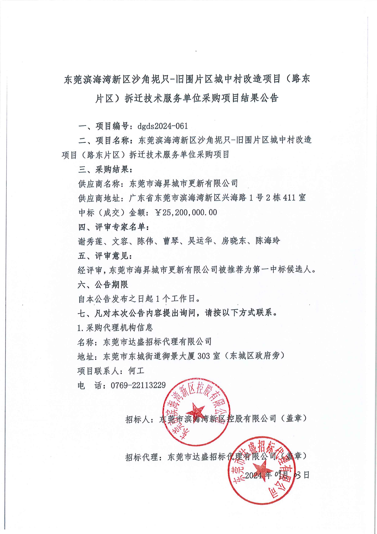 東莞濱海灣新區(qū)沙角坭只-舊圍片區(qū)城中村改造項目(路東片區(qū))拆遷技術服務單位采購項目結果公告