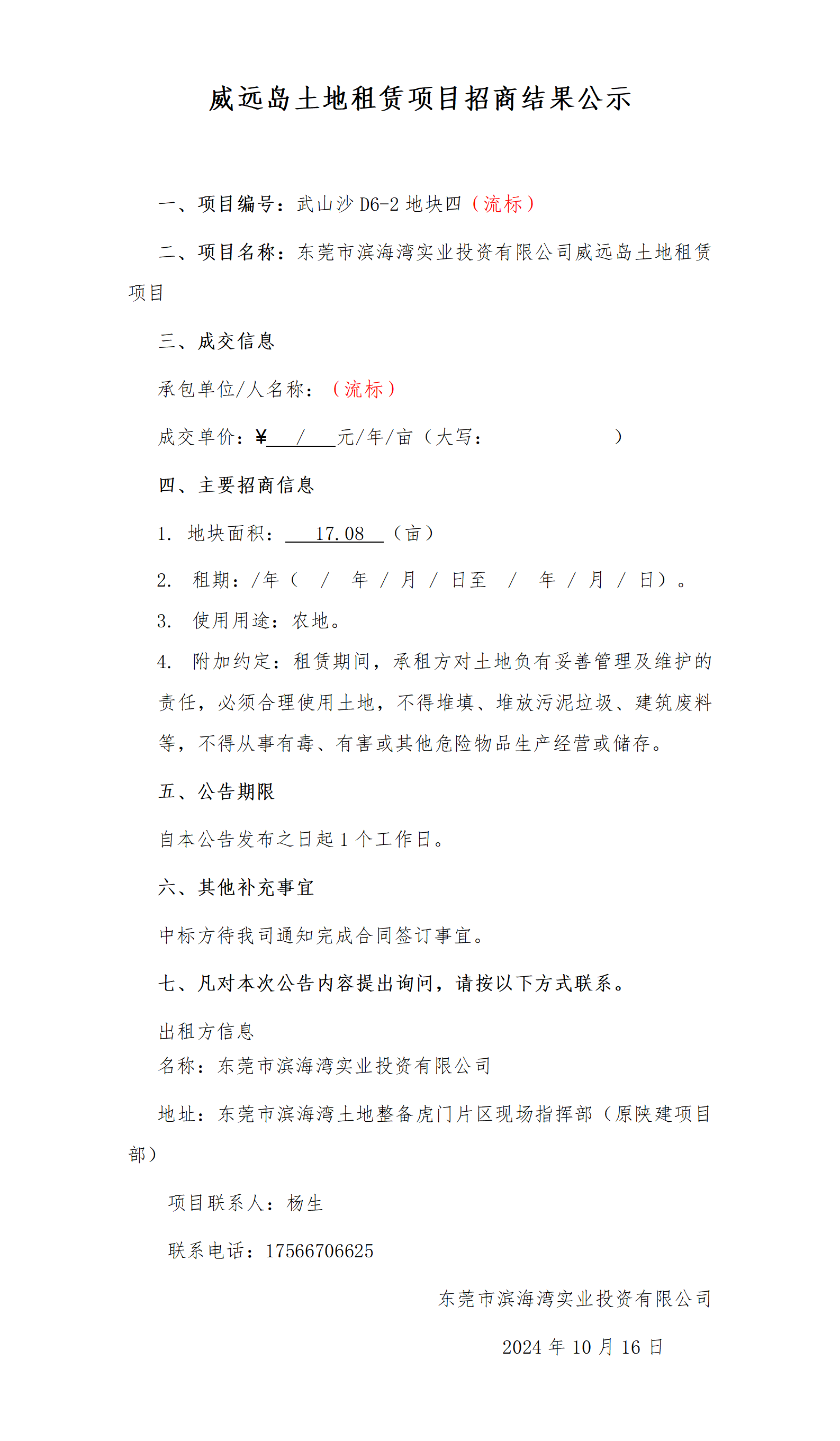 威遠(yuǎn)島土地租賃項(xiàng)目招商結(jié)果公示(武山沙D6-2 地塊四)