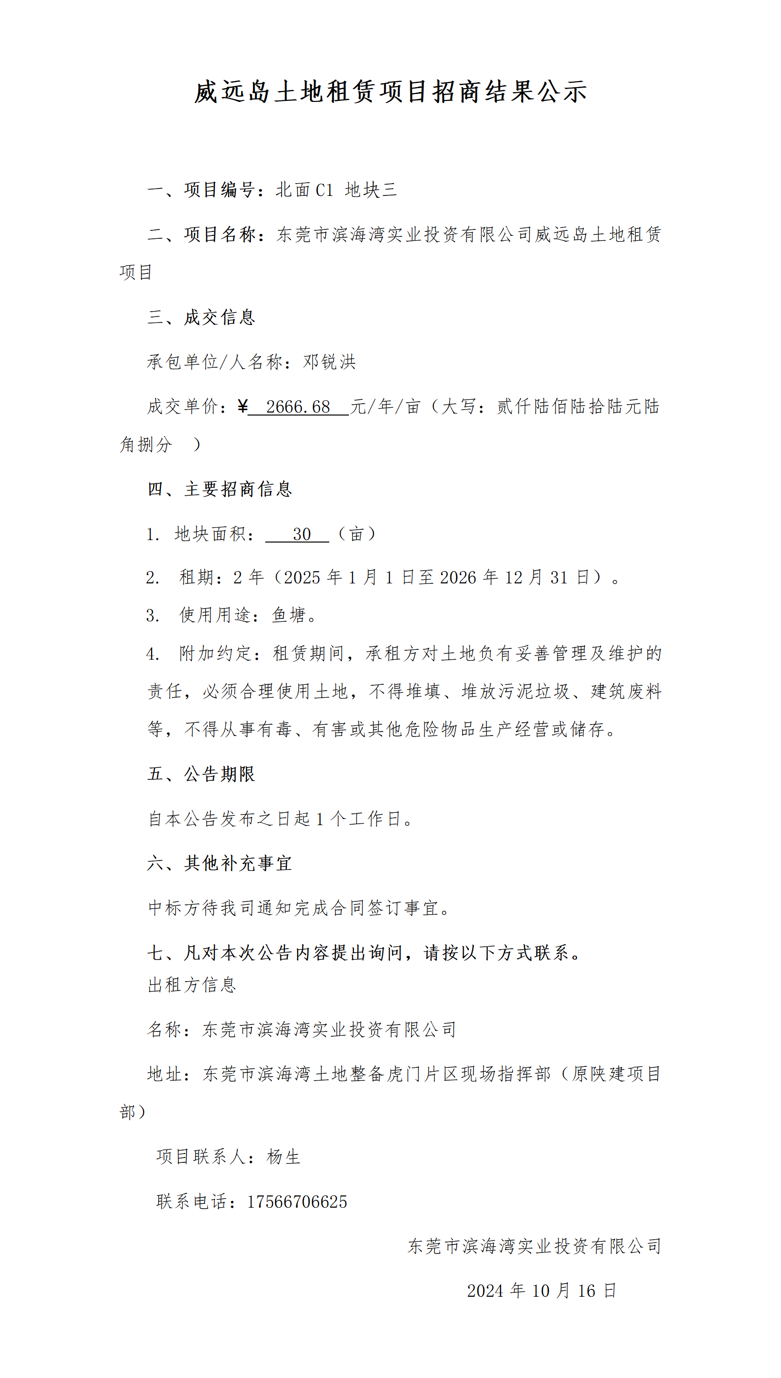 威遠(yuǎn)島土地租賃項目招商結(jié)果公示(北面C1 地塊三)