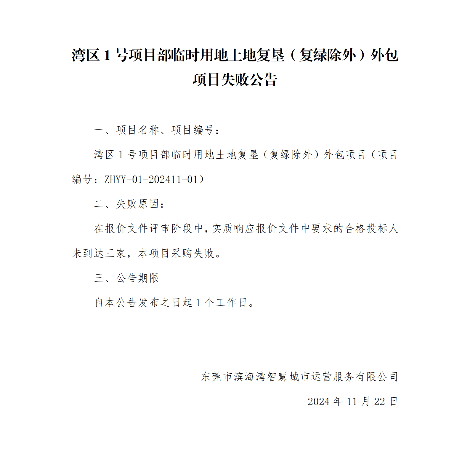 灣區(qū)1號(hào)項(xiàng)目部臨時(shí)用地土地復(fù)墾(復(fù)綠除外)外包項(xiàng)目失敗公告