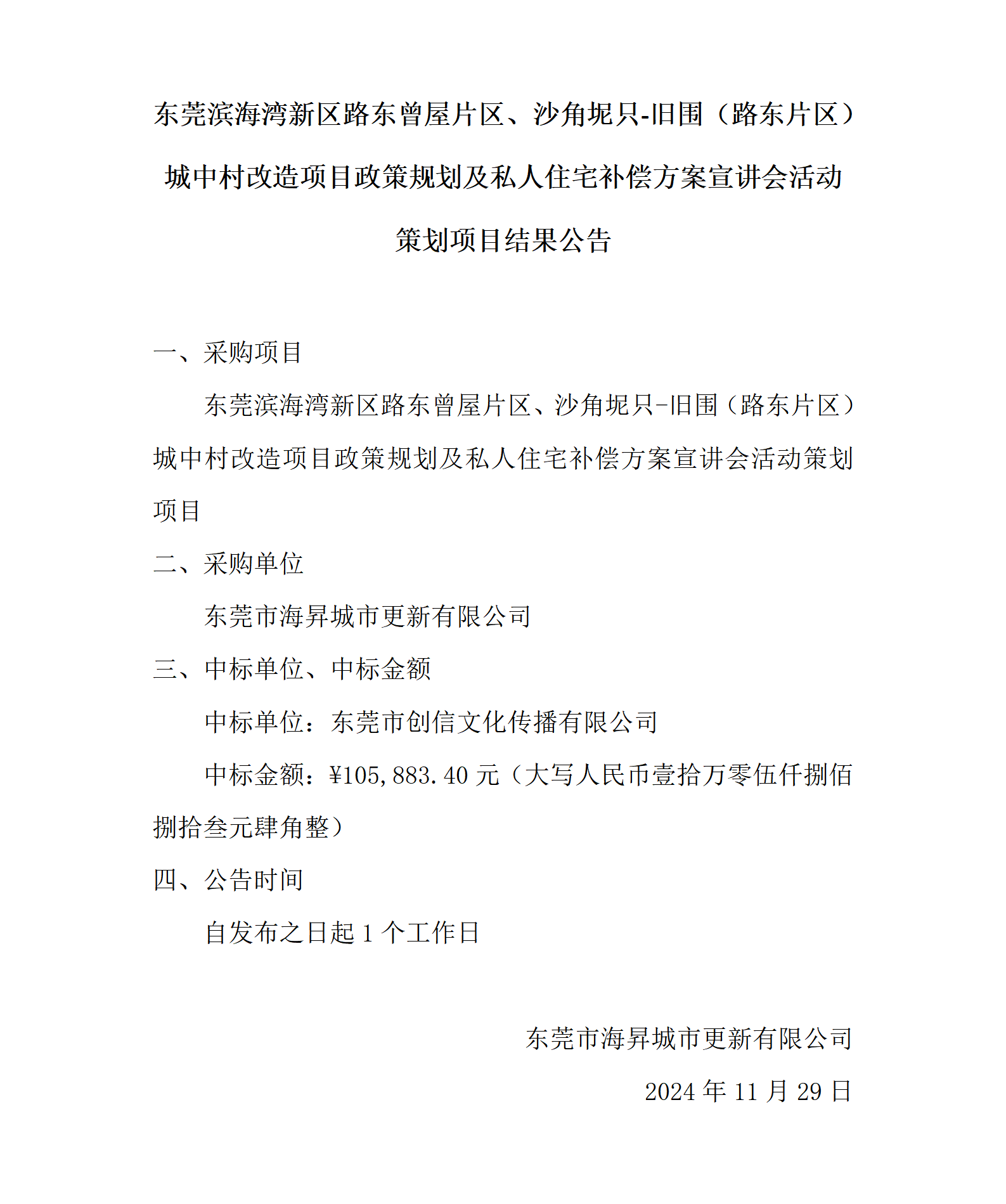 東莞濱海灣新區(qū)路東曾屋片區(qū)、沙角坭只-舊圍(路東片區(qū))城中村改造項目政策規(guī)劃及私人住宅補償方案宣講會活動策劃項目結果公告