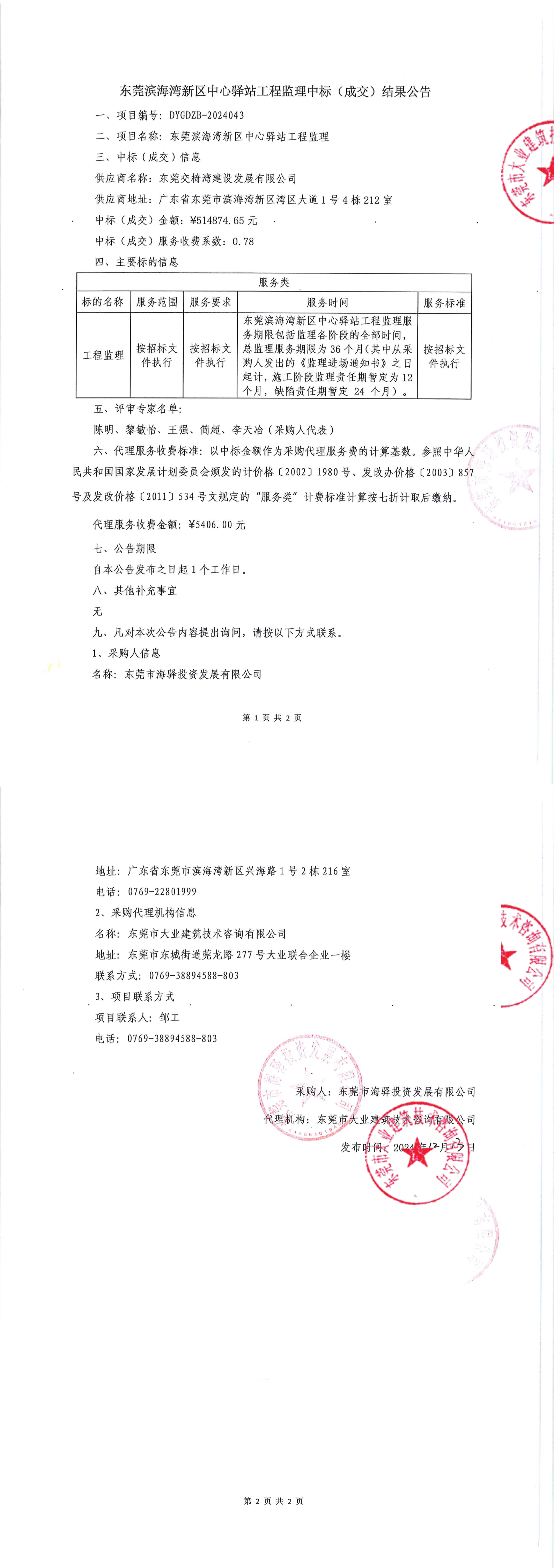 東莞濱海灣新區(qū)中心驛站工程監(jiān)理中標(成交)結果公告
