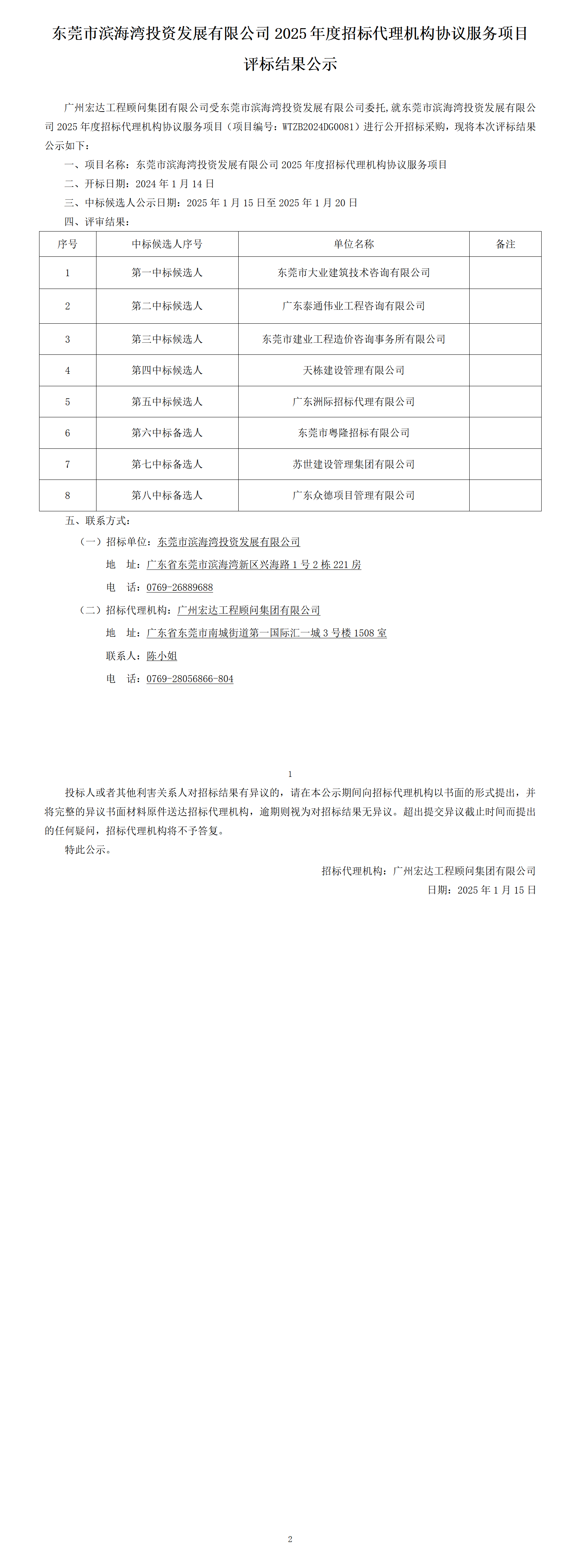 東莞市濱海灣投資發(fā)展有限公司2025年度招標代理機構協(xié)議服務項目評標結果公示