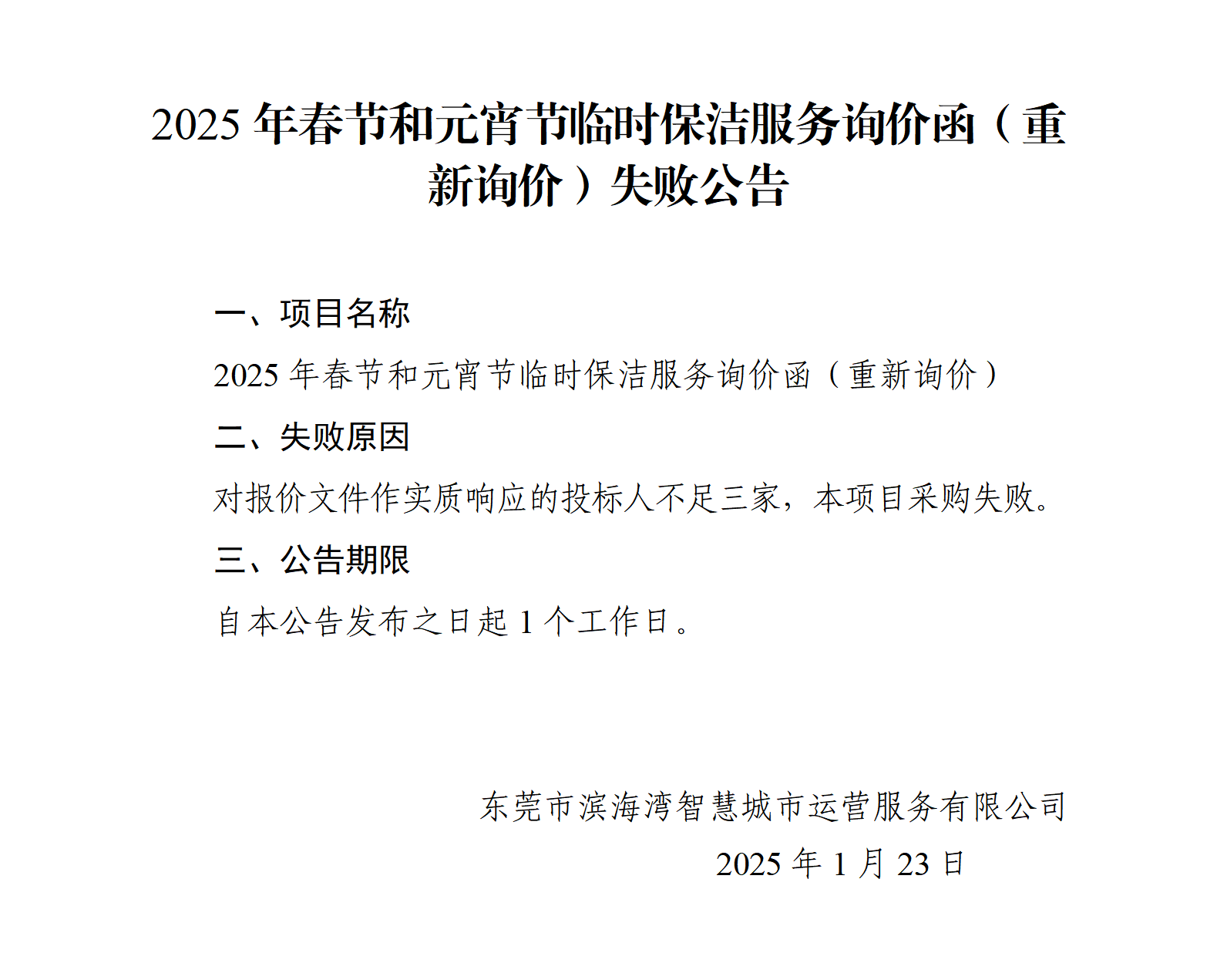 2025年春節(jié)和元宵節(jié)臨時保潔服務(wù)詢價函(重新詢價)失敗公告