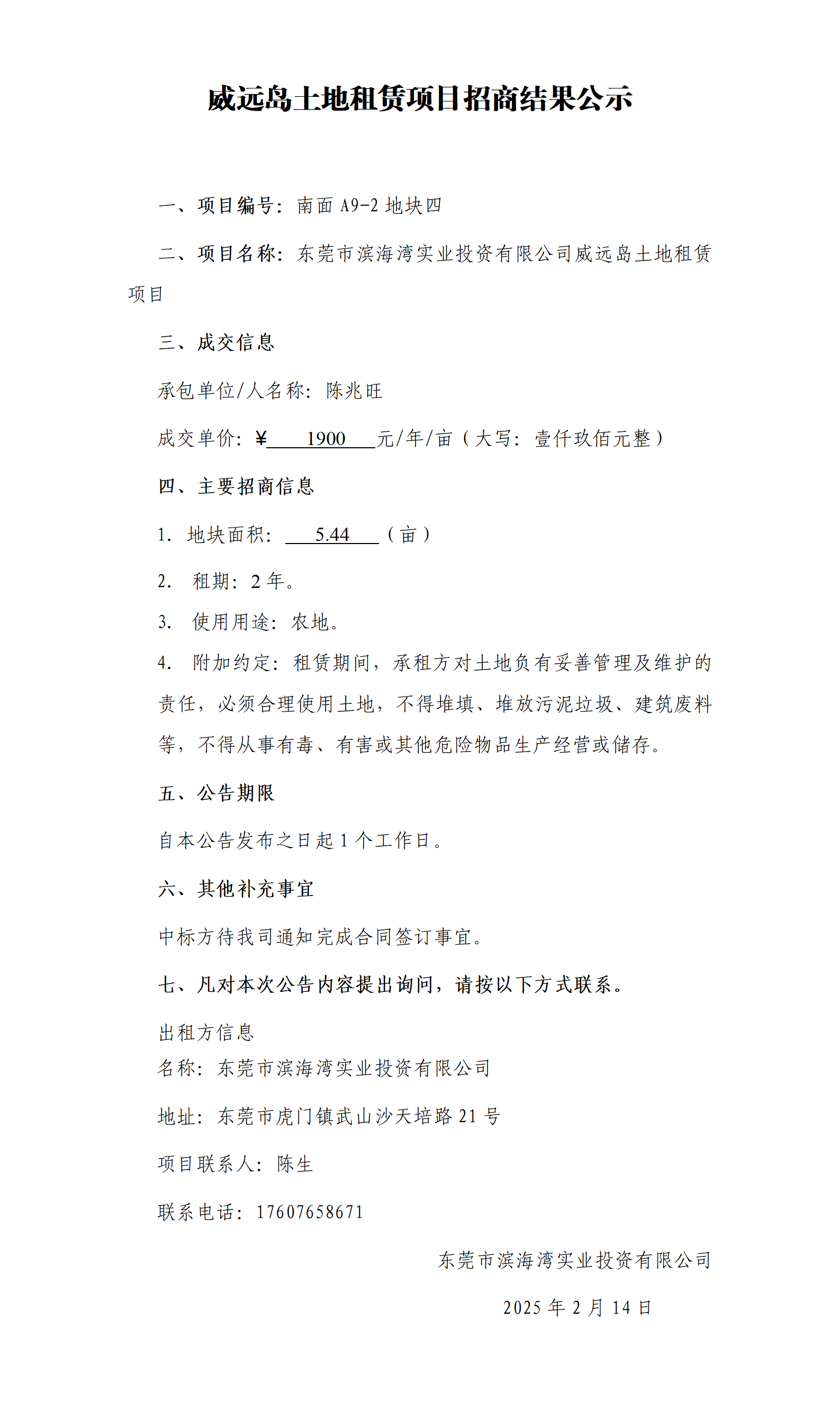 威遠(yuǎn)島土地租賃項目招商結(jié)果公示(南面A9-2 地塊四)