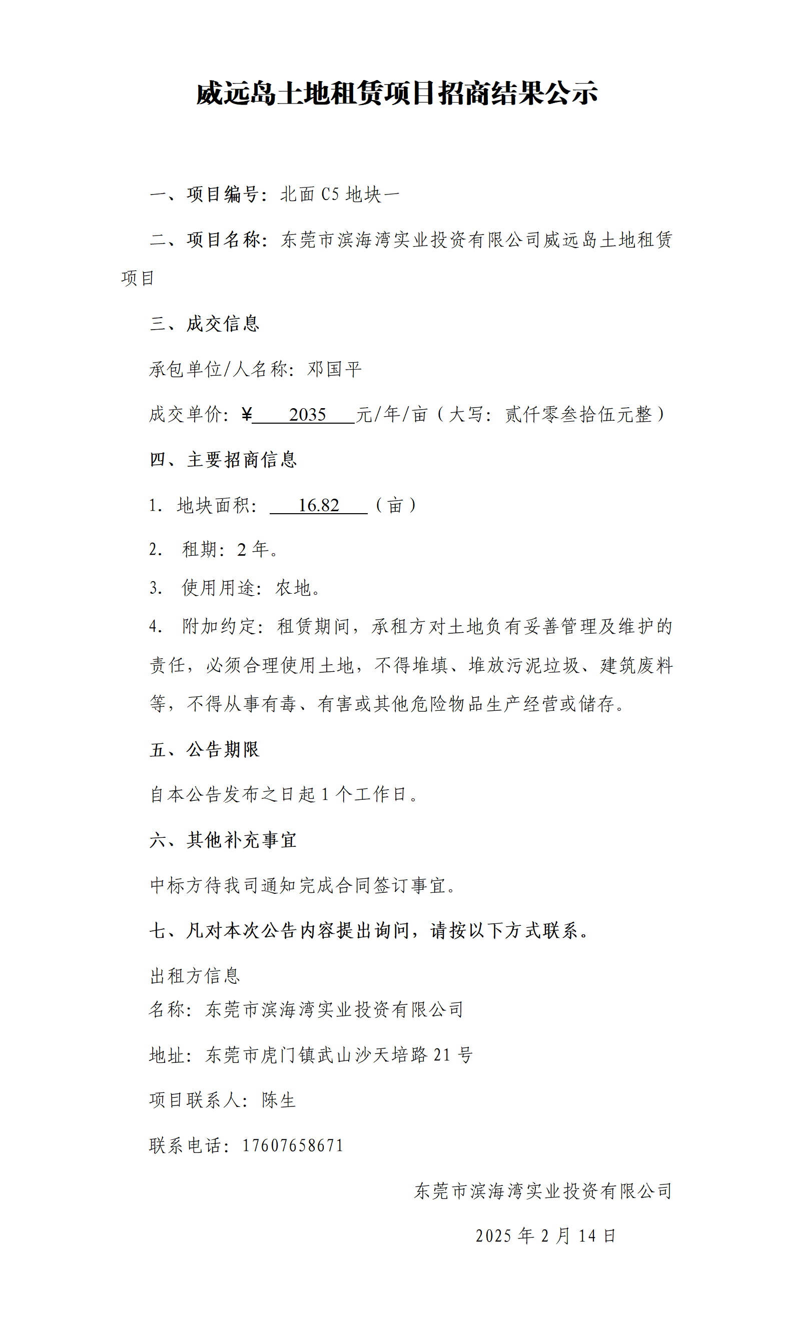 威遠(yuǎn)島土地租賃項(xiàng)目招商結(jié)果公示(北面C5 地塊一)