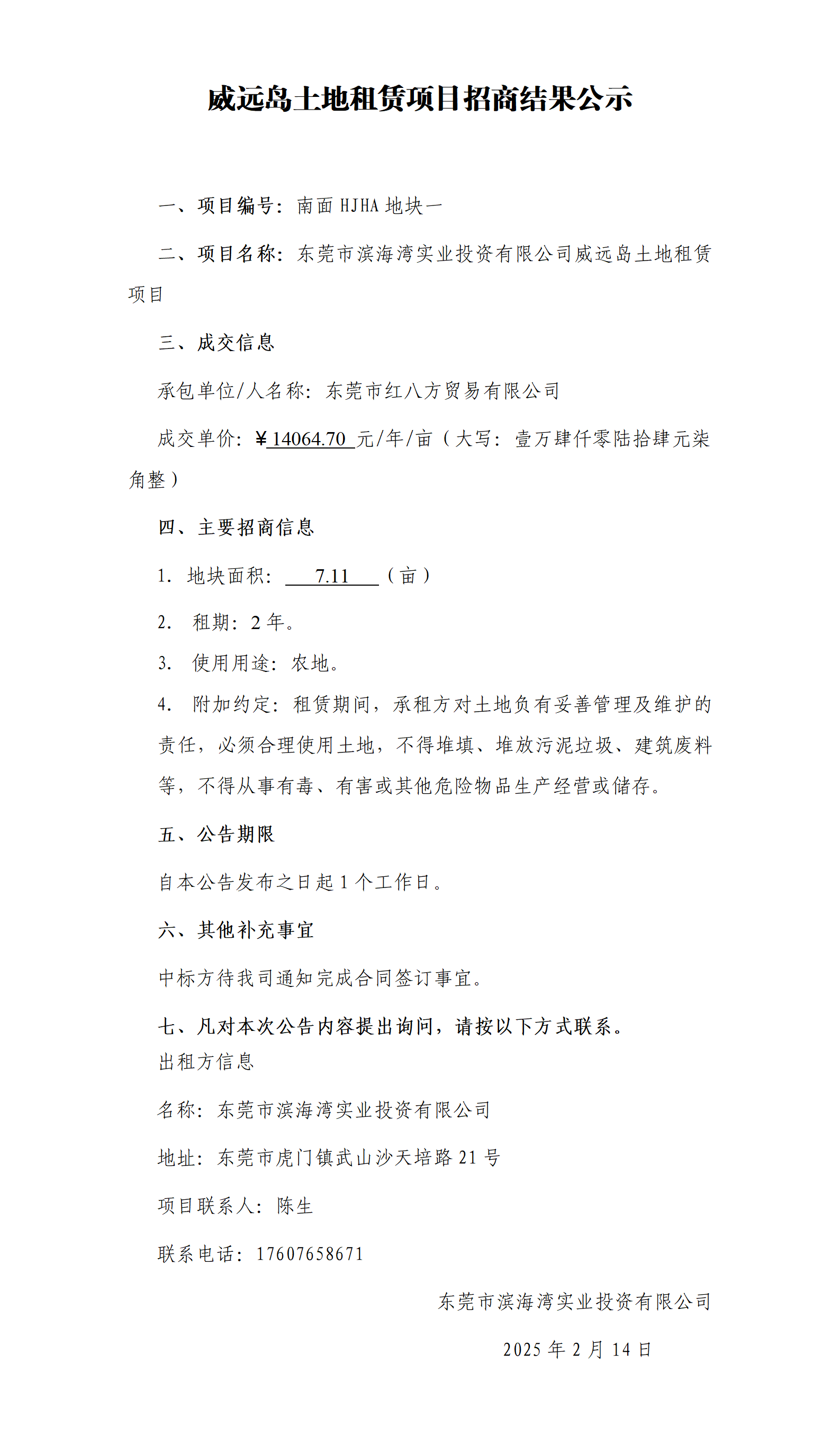 威遠(yuǎn)島土地租賃項(xiàng)目招商結(jié)果公示(南面HJHA 地塊一)