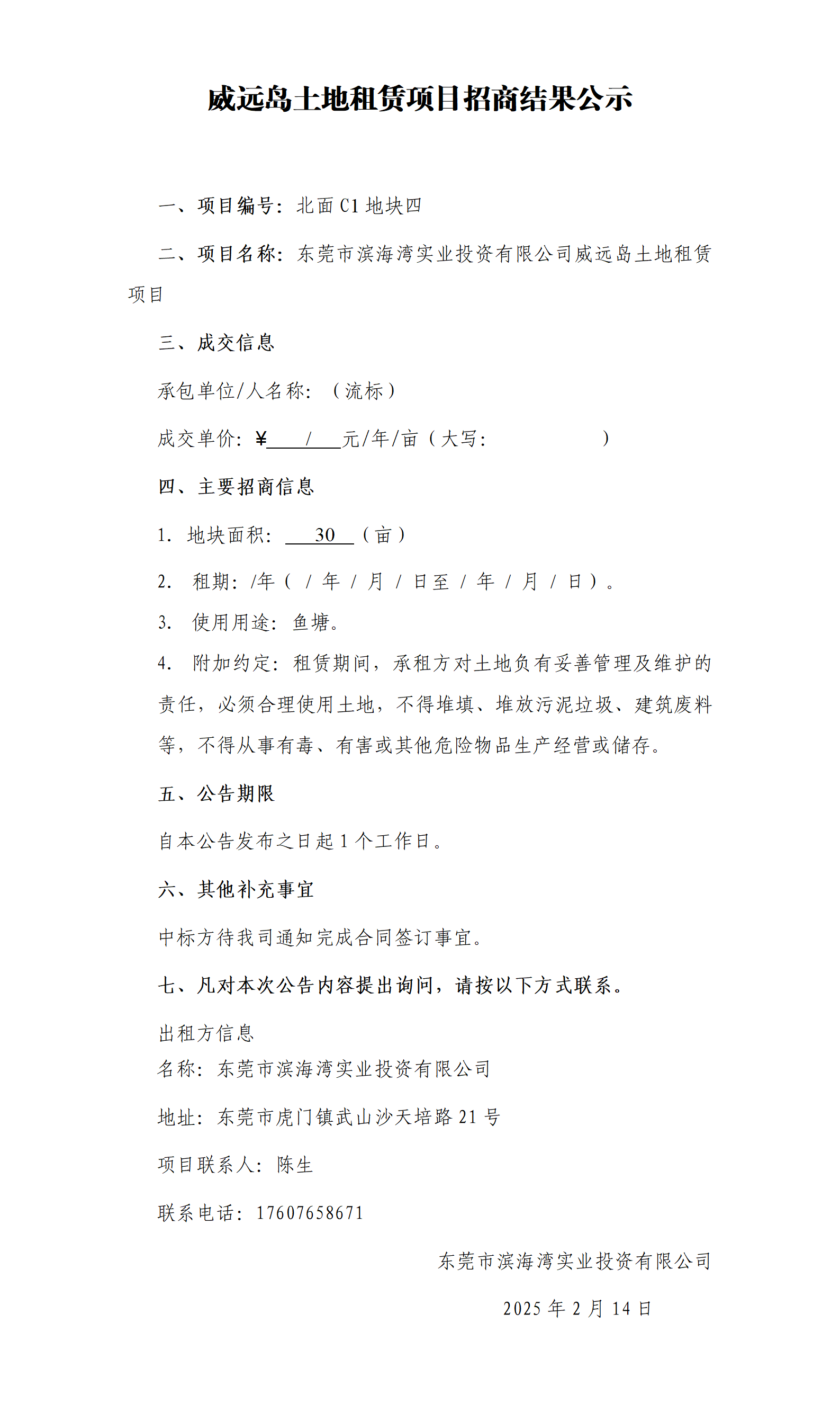 威遠(yuǎn)島土地租賃項(xiàng)目招商結(jié)果公示(北面C1 地塊四)