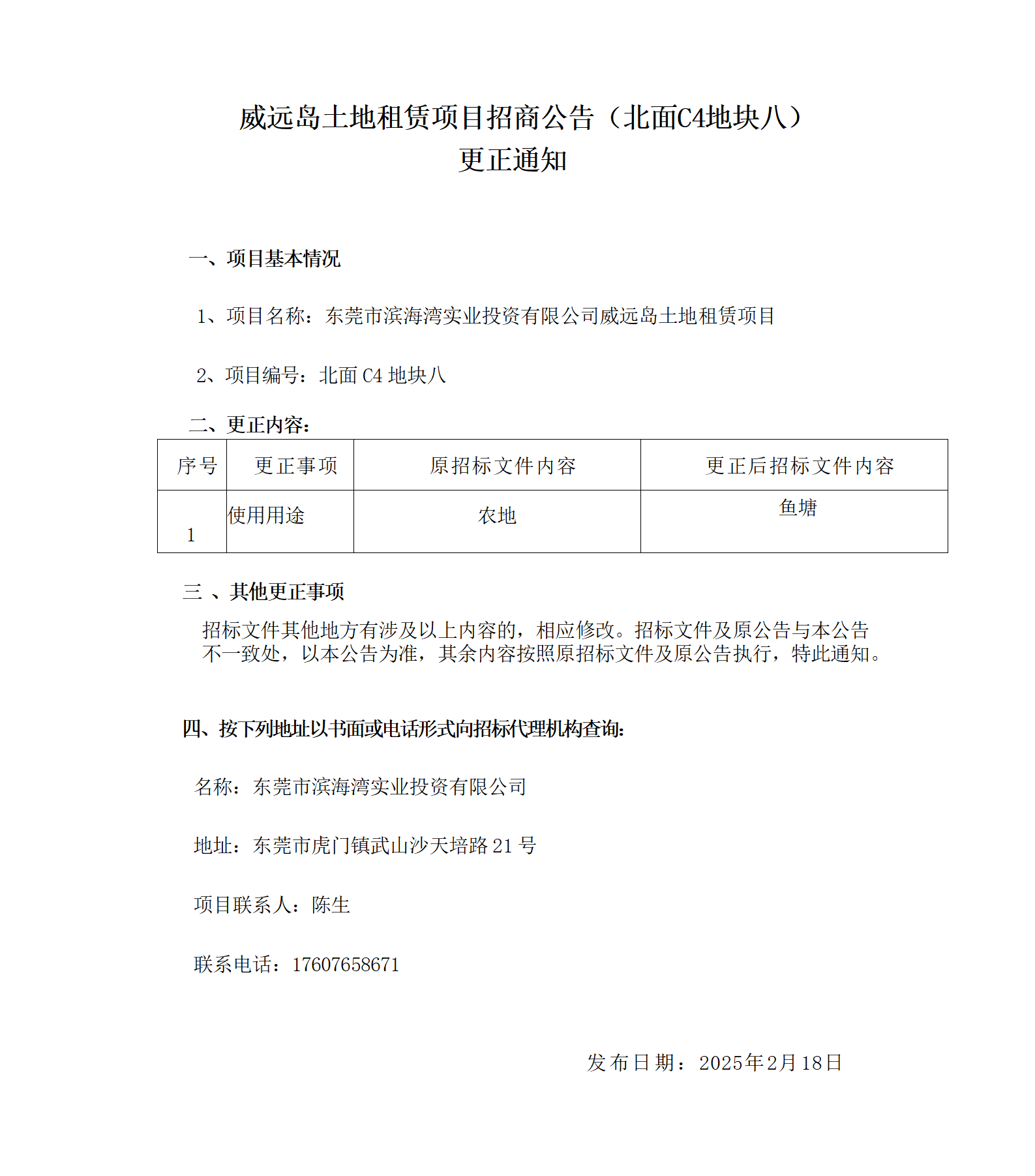 威遠島土地租賃項目招商公告(北面C4 地塊八)更正通知