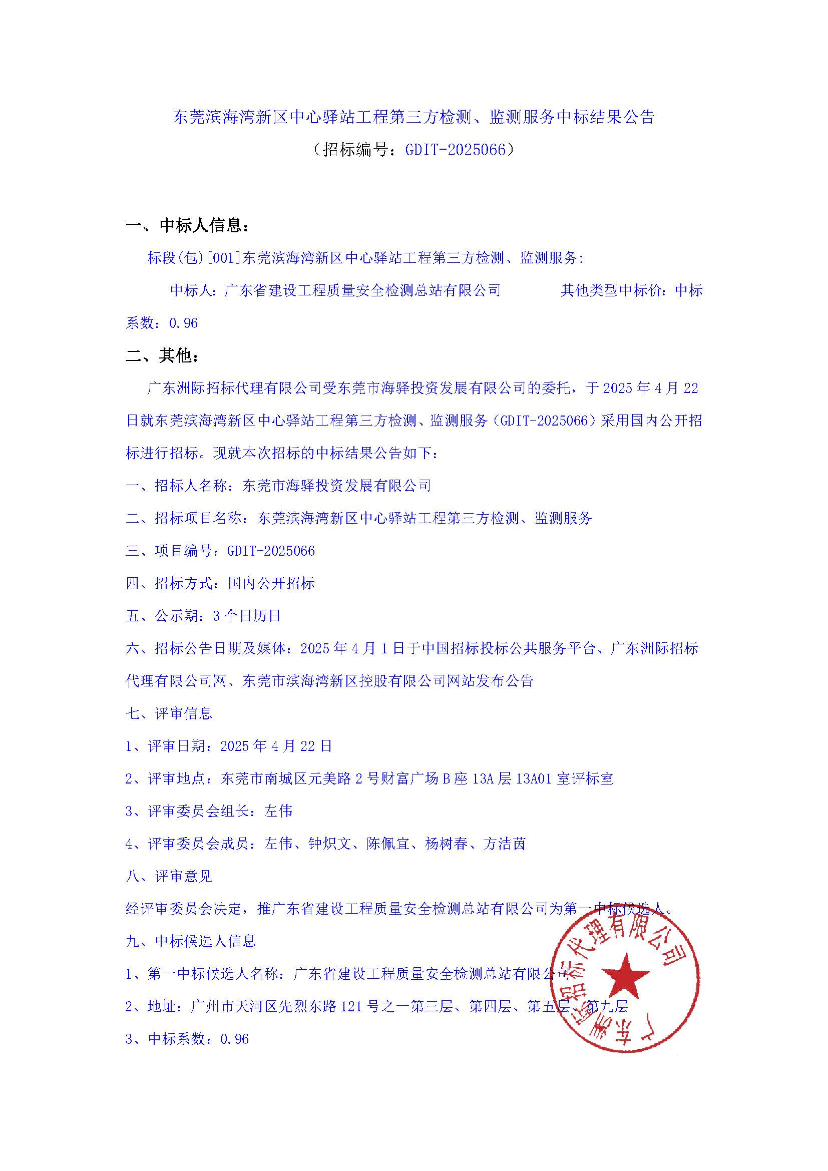 東莞濱海灣新區(qū)中心驛站工程第三方檢測、監(jiān)測服務(wù)中標結(jié)果公告