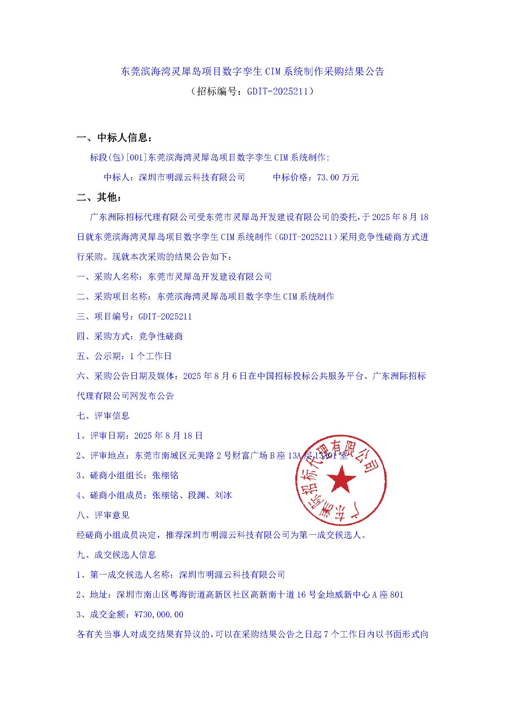 東莞濱海灣靈犀島項(xiàng)目數(shù)字孿生 CIM 系統(tǒng)制作采購(gòu)結(jié)果公告