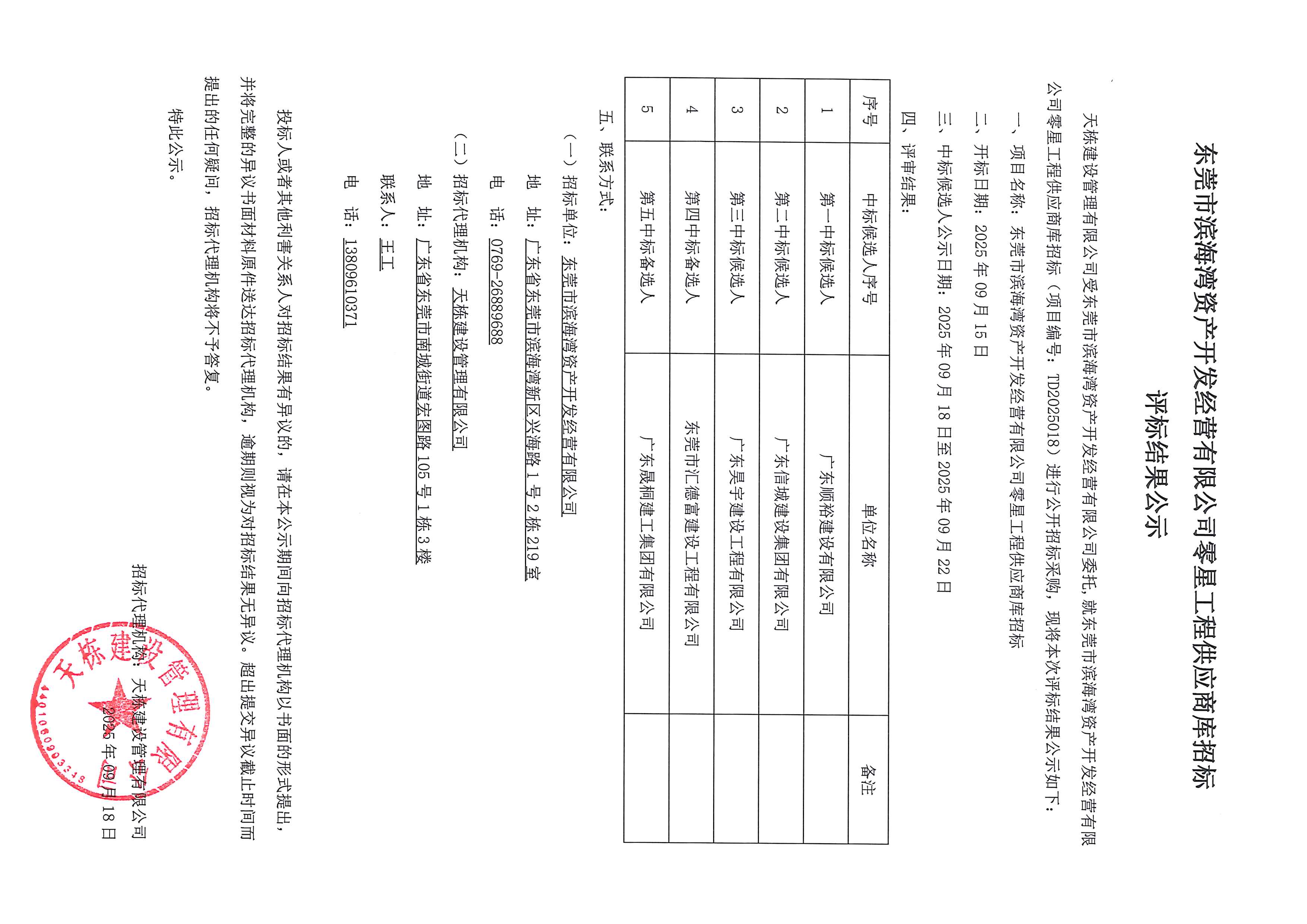 東莞市濱海灣資產(chǎn)開發(fā)經(jīng)營有限公司零星工程供應(yīng)商庫招標(biāo)評標(biāo)結(jié)果公示