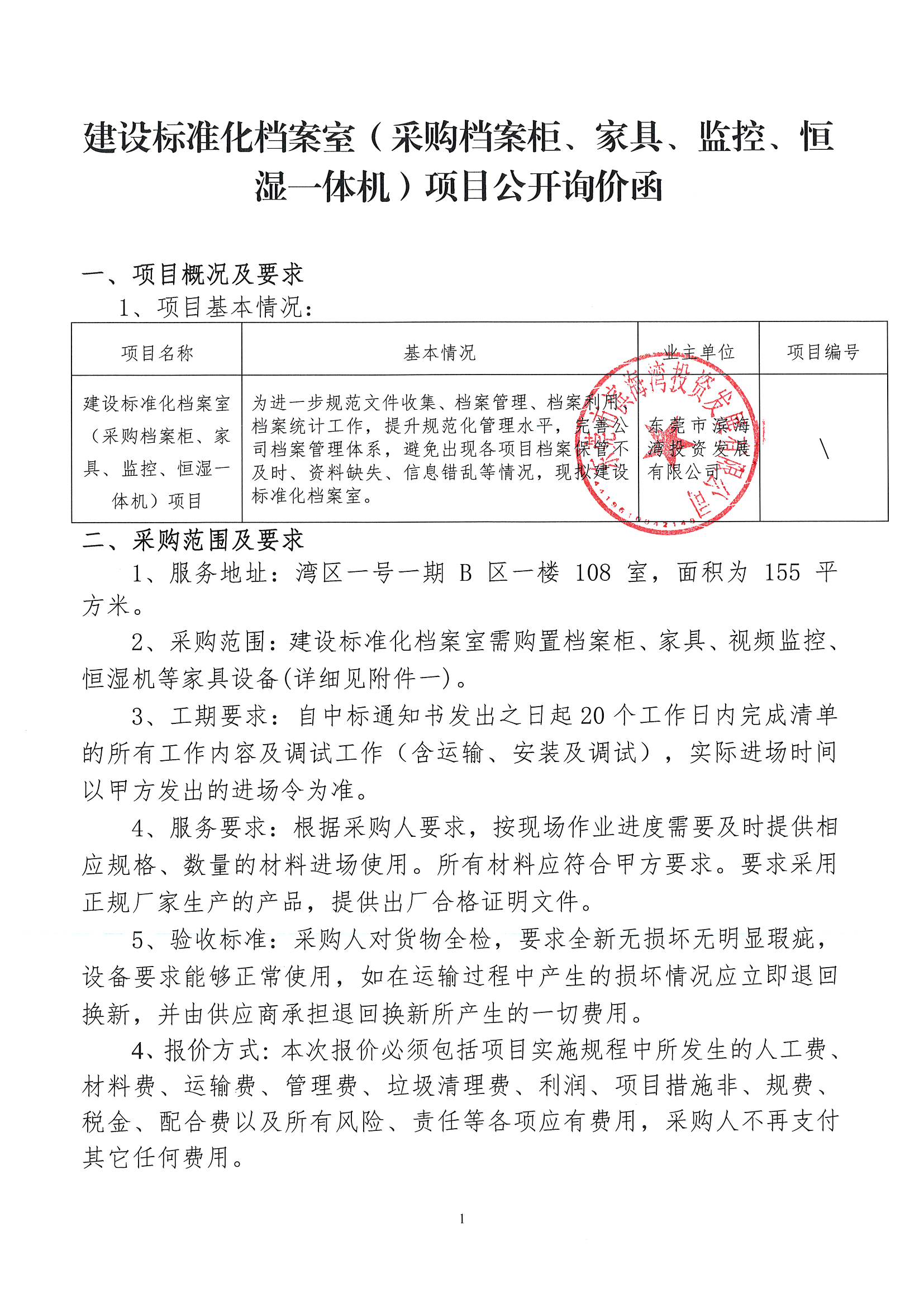 附件1:建設標準化檔案室(采購檔案柜、家具、監(jiān)控、恒濕一體機)項目公開詢價函
